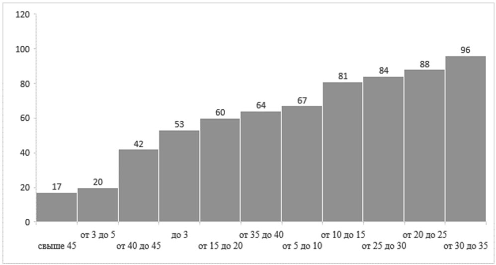 Медицинский стаж работы респондентов находится в диапазоне от 10 до 35 лет (52 %) (рис. 3). Характеризуя глубину знакомства с методами и инструментарием МИ с ИИ, 41 % опрошенных знает о таких медицинских изделиях, 45 % что-то слышали об этом. В целом отношение к внедрению ИИ в рабочий процесс нейтральное и положительное, 50 и 43 % соответственно.
