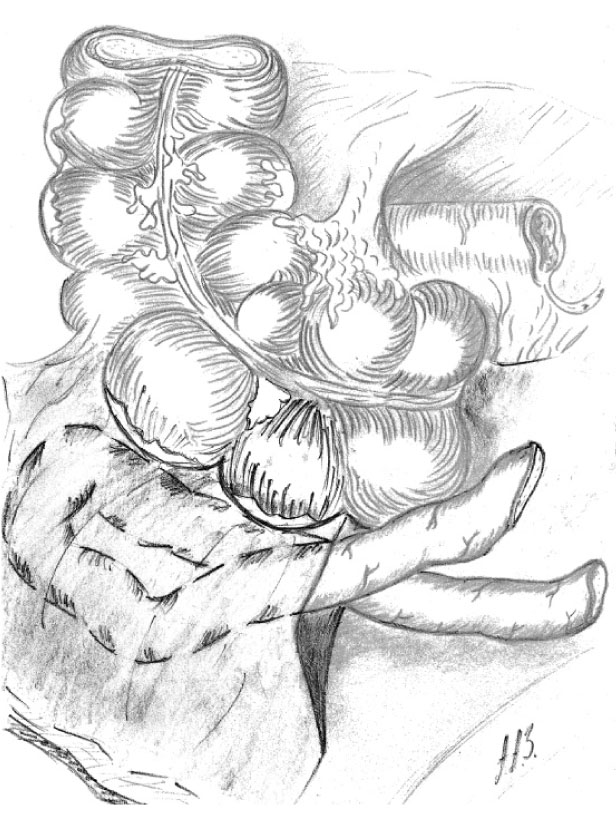 Назначено лечение, включающее инфузионную терапию, спазмолитики, коррекцию сопутствующей патологии, на фоне которого наступило клиническое улучшение. В течение 5 дней чувствовала себя вполне удовлетворительно, хотя несколько раз возникали неинтенсивные приступы болей в правой половине живота. На 6-е сутки пребывания в стационаре отметила резкое ухудшение – появились схваткообразные боли в животе, поведение во время приступа болей беспокойное. Живот визуально не вздут, болезненный в правой половине с нечетко пальпируемым «инфильтратом». Симптомы раздражения брюшины отрицательны. На срочной обзорной рентгенографии брюшной полости – признаки кишечной непроходимости. Диагноз: Острая спаечная кишечная непроходимость. Больной назначена консервативная терапия, направленная на купирование непроходимости, контроль пассажа контраста. Однако в течение 6 часов консервативная терапия оказалась неэффективной, признаки кишечной непроходимости прогрессировали и больная в срочном порядке оперирована дежурной бригадой хирургов. Срединная лапаротомия. В брюшной полости около 100,0 мл серозного выпота. На протяжении 1,5 метров от связки Трейтца тонкая кишка дилатирована до 4 см. Обнаружена эластичная фиксация петли кишки в правой подвздошной области. При незначительной тракции кишка извлечена из брюшинного кармана, расположенного между слепой кишкой и боковой стенкой живота (рис. 1).