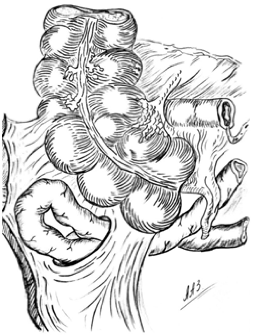 Рис. 2. Парацекальная грыжа, ущемленная в верхнем илеоцекальном кармане
