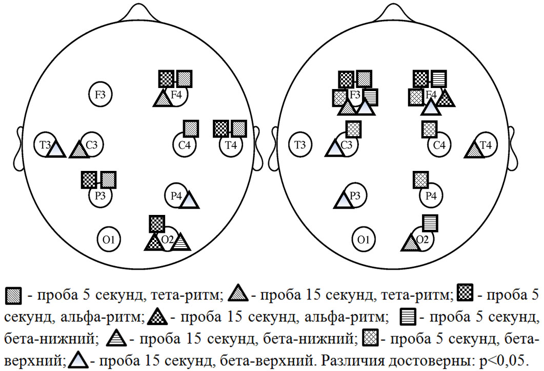 ЭЭГ выполнили на электроэнцефалографе «Неокортекс» ООО «Нейроботикс» (г. Зеленоград) монополярно по схеме «10–20» в фронтальных (F3, F4), париетальных (Р3, Р4), височных (Т3, Т4,), центральных (С3, С4) и затылочных (О1, О2) отведениях. ЭЭГ регистрировали с включенным режекторным фильтром (50 Гц) и выключенными фильтрами высоких и низких частот с частотой дискретизации 1 кГц при разрядности АЦП – 16 бит, использовали хлорсеребряные электроды фирмы «MКС» (Россия). Объединённые референтные электроды располагались на мочках ушей. Спектральную плотность мощности (СПМ) сигналов вычисляли в период 3 секунды после отмеривания временного интервала в диапазонах частот θ – тета-ритма (4–7 Гц), α – альфа-ритма (7–14 Гц), нижнего β1 и верхнего β2 бета-ритмов (14–24 и 24–40 Гц соответственно) после классического дискретного преобразования Фурье [6].