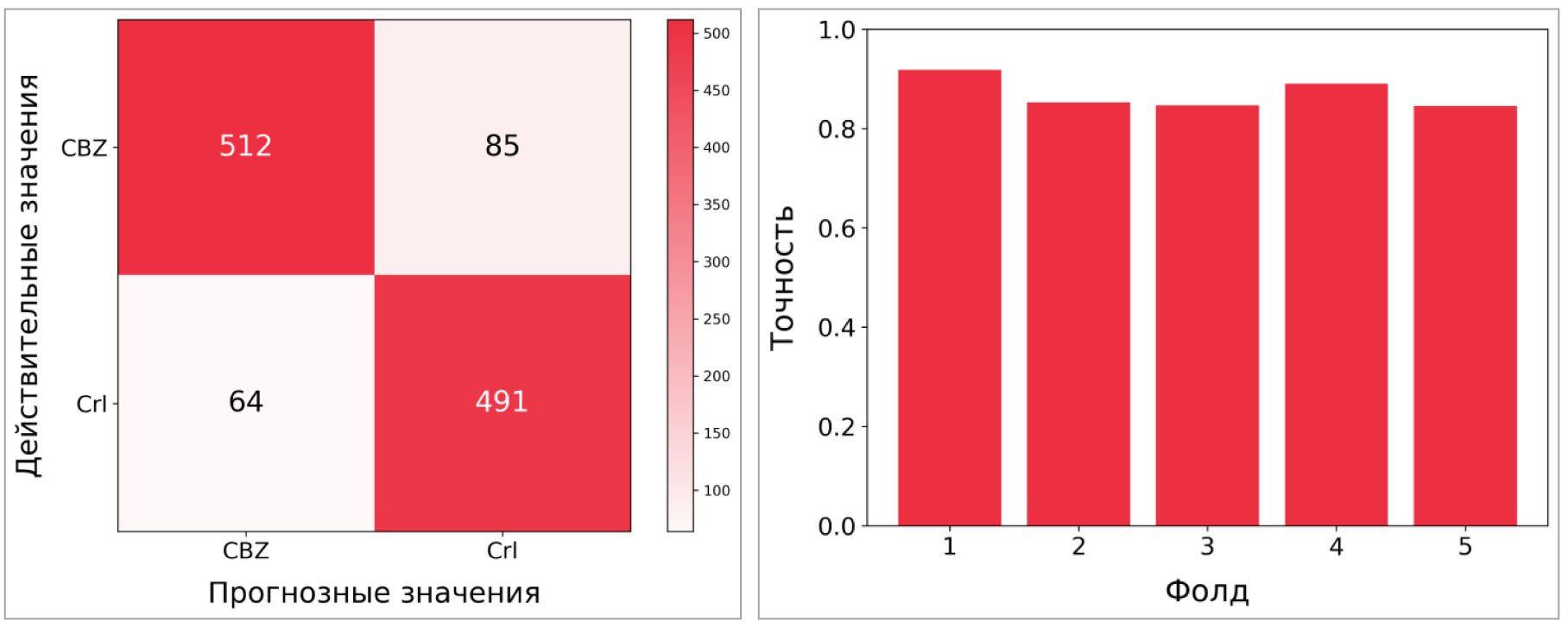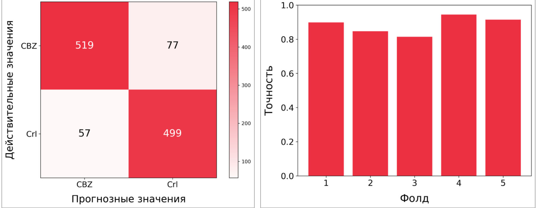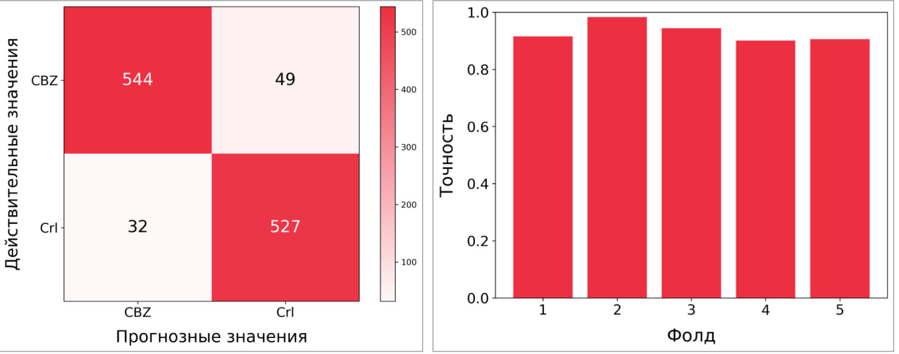 Производительность моделей оценивалась методом 5-кратной кросс-валидации на сигналах, зарегистрированных у животных, которые получали карбамазепин или физиологический раствор. Этот набор данных был разделен на пять равных частей. Из них четыре использовались для обучения модели, а одна – для оценки производительности, с построением матриц несоответствий и расчетом показателей точности для каждой итерации кросс-валидации. Затем проводили оценку качества моделей на тестовой выборке сигналов, полученных после введения соединения РУ-1205.