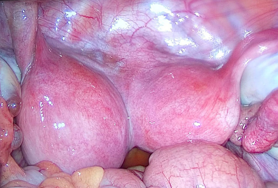 Рис. 4. Диагностическая лапароскопия. Рудиментарный фимбриальный отдел левой маточной трубы, соединенный с гематосальпинксом