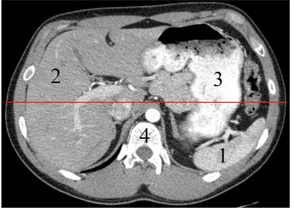 Рис. Компьютерная томограмма органов брюшной полости и забрюшинного пространства в аксиальной проекции: 1 – селезенка, 2 – печень, 3 – желудок, 4 – позвонок. Красной линией обозначено деление брюшной полости на передний и задний отделы