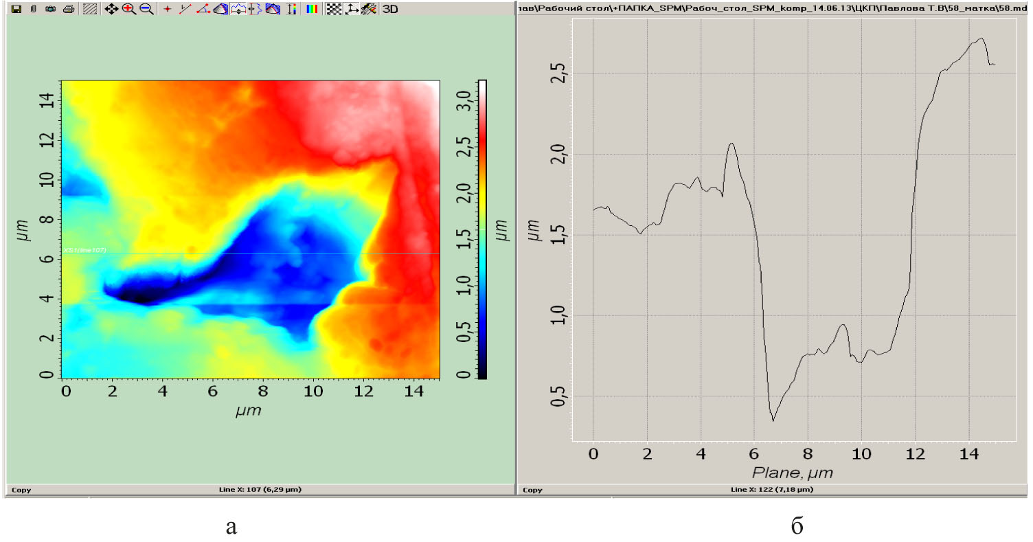 Рис. 3. Фрагменты миометрия матки женщин с СД 2-го типа. Начало образования тромба в спиральной артерии матки (а, б, в) и его наличие (г). Атомно-силовая микроскопия. Б – графическое изображение рис. 3а (двухмерное изображение)