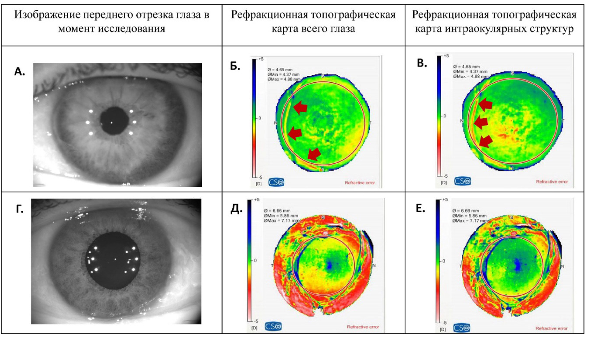 Рефракционные карты всего глаза и изолированно интраокулярных структур при проведении исследования при медикаментозном мидриазе также представлены на рис. 3 (Г, Д, Е). Видно, что ПСАВФ в условиях медикаментозного расширения зрачка позволяет определять состояние переднего капсулорексиса не только локально, но и на всем его протяжении.