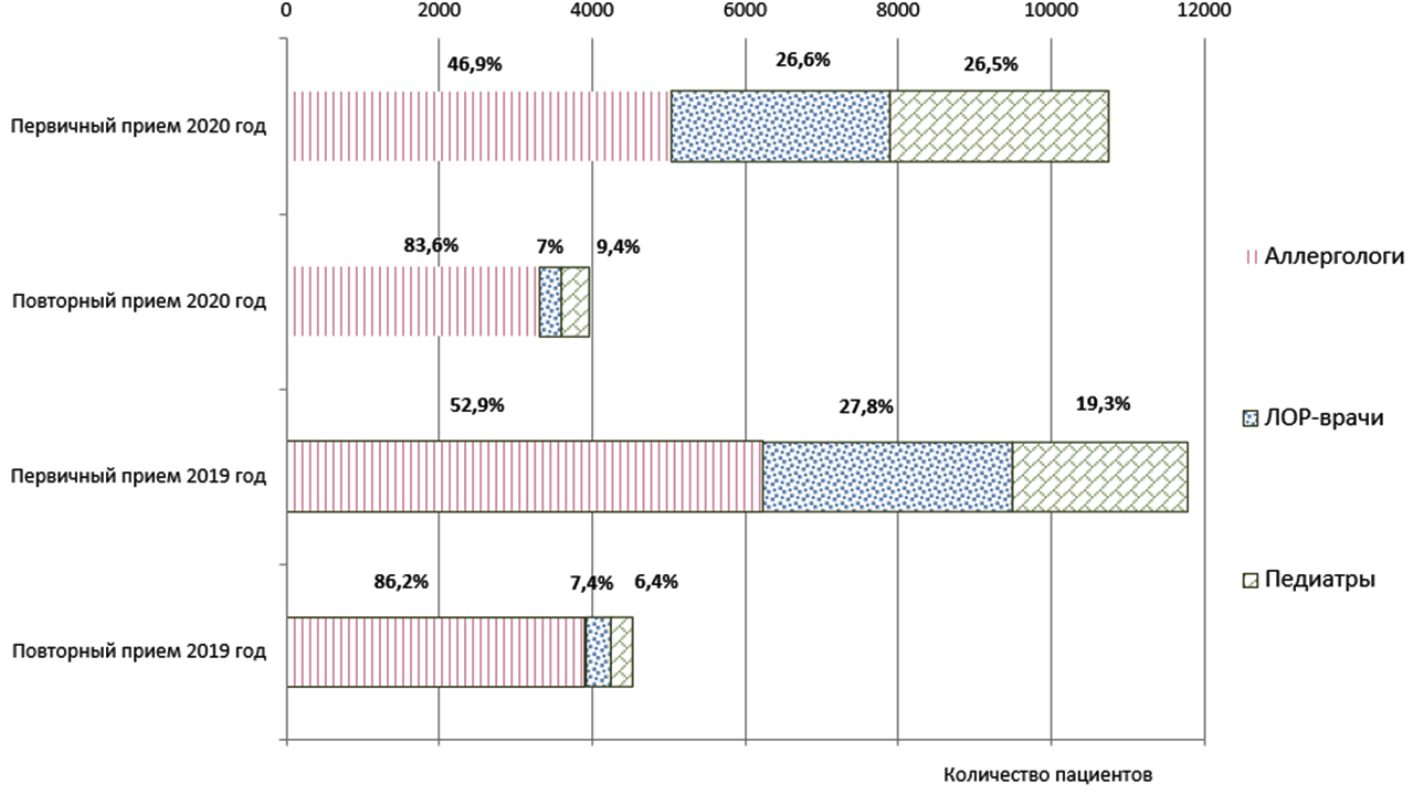 Значительное снижение повторных обращений пациентов с АР к специалистам, 36,8 % от числа первичных обращений (3959/10750), наблюдалось и в 2019 году. При этом 83,6 % (3309/3959) повторных обращений были к аллергологам-иммунологам; 7 % (277/3959) – к оториноларингологам; 9,4 % (373/3959) – к педиатрам. Количество госпитализаций с целью получения курса аллерген-специфической иммунотерапии составило 543 случая (рис. 1) [9].