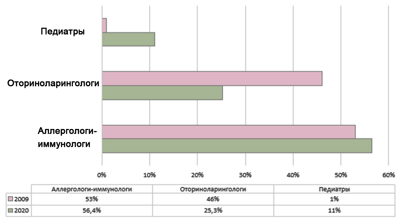 В 7,3 % (20/280) амбулаторных карт информация о специалисте, выставившем впервые диагноз АР, отсутствовала. Преимущественно изначально диагноз АР выставлен пациентам врачами-аллергологами: в 56,4 % (158/280) случаев. Реже в постановке диагноза принимали участие оториноларингологи и педиатры, 25,3 % (71/280) и 11 % (31/280) соответственно, что совпадает с официальными данными Территориального фонда обязательного медицинского страхования Волгоградской области при оценке структуры обращаемости пациентов с диагнозом аллергический ринит. Однако роль врача-педиатра в первичной диагностике АР у детей в течение 10 лет значительно возросла (рис. 2).