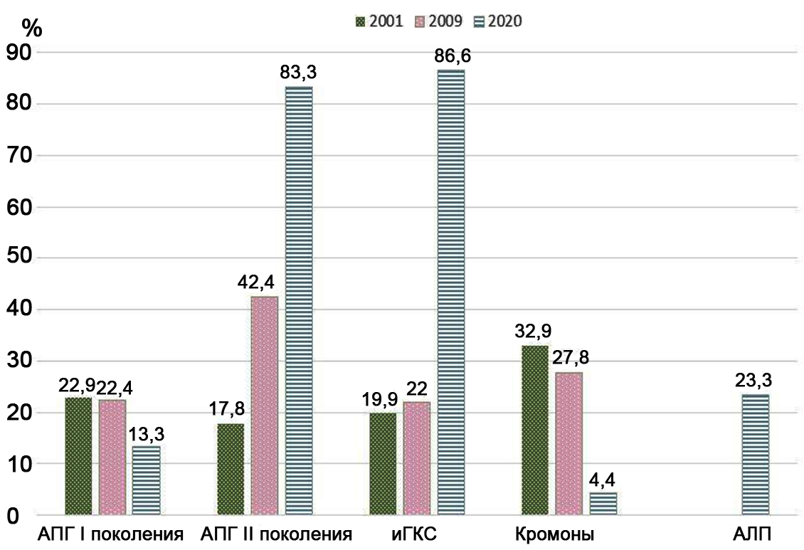 Анализ структуры назначения лекарственных средств для терапии АР у детей проведен с 10-летним интервалом в сравнении с результатами предыдущих фармакоэпидемиологических исследований, выполненных рабочей группой Волгоградского государственного медицинского университета в 2009 и 2001 гг. (рис. 3).