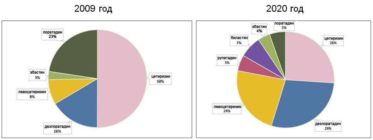 Наиболее часто из АГП II поколения по данным анализа амбулаторных карт назначались цетиризин (Зодак®, Санофи Россия, РФ; Цетрин®, Dr. Reddy’s, LTD, Индия), дезлоратадин (Эриус®, Байер, Россия) и левоцетиризин (Ксизал®, UСВ Farmchim, S.A., Швейцария; Супрастинекс®, EGIS Pharmaceuticals, PLC, Венгрия) – 26,5; 28,7 и 31,2 % (соответственно в 2020 г., 50; 16 и 8 % в 2009 г.) от всех назначений данной группы препаратов. биластин (Никсар®, Берлин-Хеми/А. Менарини, Россия) и рупатадин (Рупафин®, J.Uriach & Cia, S.A., Испания) составляют только 6,3 % от всех назначений АГП II поколения (рис. 4).