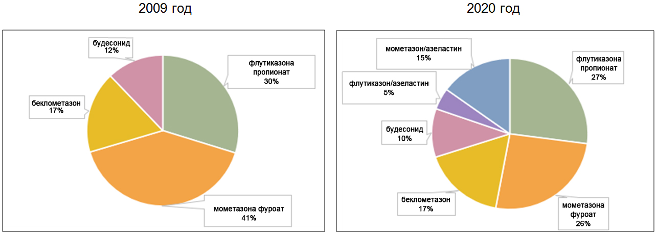 Вторыми по частоте назначений являются интраназальные глюкокортикостероиды (ИНГКС) – 86,6 % пациентов. В соответствии с современными клиническими рекомендациями ИНГКС являются препаратами выбора при среднетяжелом и тяжелом АР, так как превосходят по силе действия антигистаминные средства системного действия, эффективно уменьшают выраженность таких симптомов, как заложенность носа, зуд, чихание, ринорея за счет выраженного противоаллергического, противовоспалительного и сосудосуживающего действия. Также отмечено положительное действие ИНГКС на глазные симптомы у пациентов с АР в сочетании с аллергическим конъюнктивитом [14, 17, 18, 19, 20]. Среди ИНГКС наиболее часто врачами рекомендовалось применение флутиказона пропионата (Фликсоназе®, GlaxoSmithKline, Италия; Назарел®, TEVA Czech Industries, Чешская Республика) и мометазона фуроата (Назонекс®, Schering-Plough Labo N.V., Бельгия; Мометазон Сандоз®, Sandoz, Словения) – 27,1 и 25,8 % соответственно от всех назначений данной группы препаратов (рис. 5).