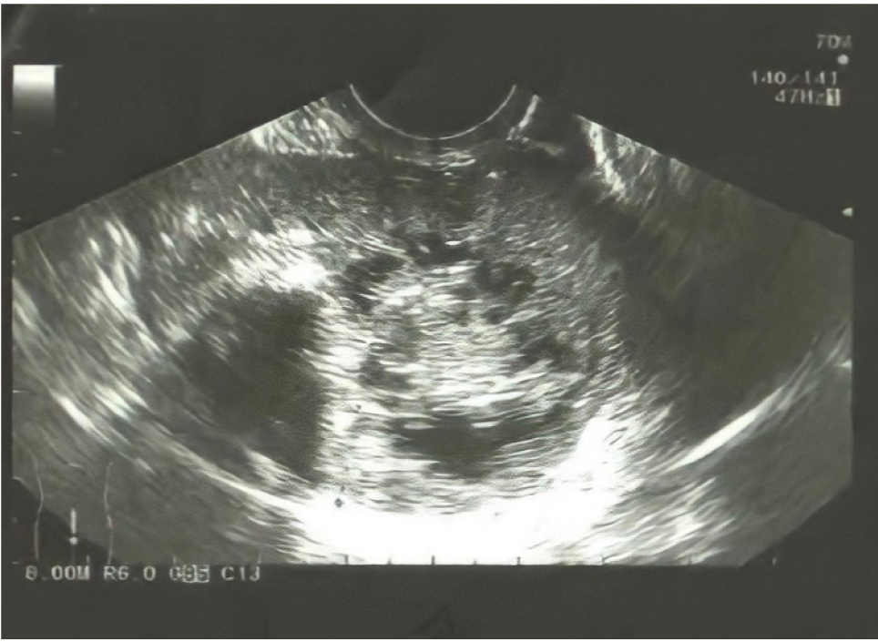 Пациентка К., 20 лет, обратилась к врачу-гинекологу с жалобами на боль во время полового акта и менструации. По результатам УЗИ (рис. 1): патологическое гетерогенное образование с ровными контурами и гипоэхогенным содержимым в позадиматочном пространстве, кровоток не регистрировался.