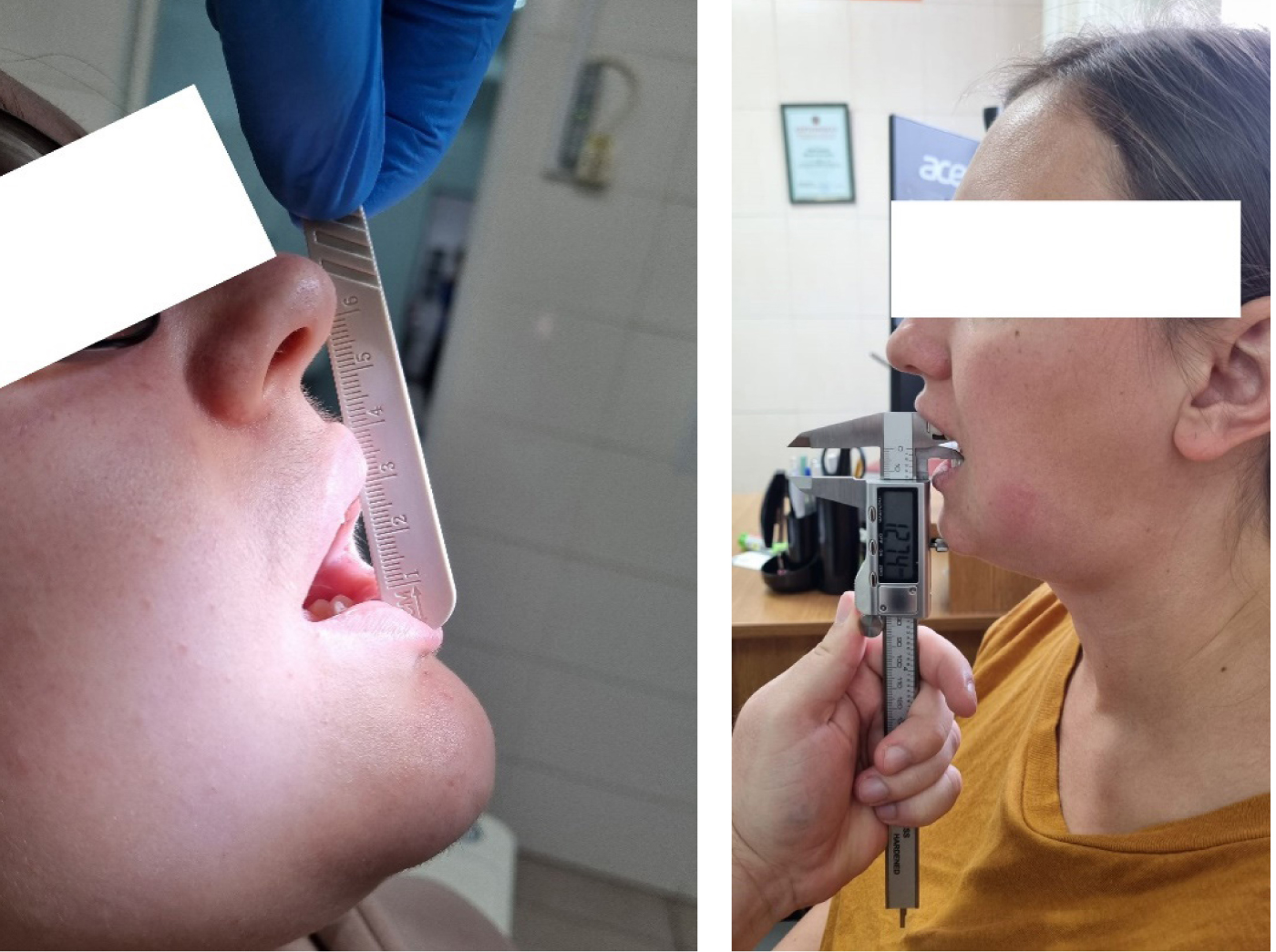 Дополнительные методы обследования включали в себя проведение конусно-лучевой компьютерной томографии (рис. 1), измерение расстояния между центральными резцами нижней и верхней челюсти (рис. 2), для оценки функционального состояния жевательных мышц было проведено электромиографическое исследование.