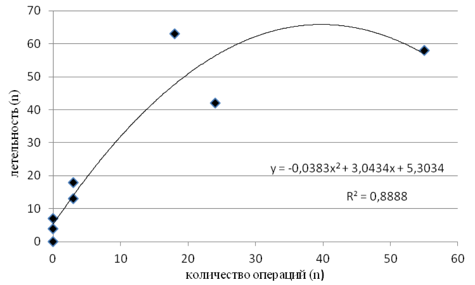 На основании программного расчета критерия корреляции Пирсона и регрессионного анализа установлено, что между количеством лапароскопических операций (n = 103) и госпитальной летальностью (n = 240) имеется статистически достоверная прямая сильная корреляционная связь (r = 0,862, t = 4,175, p < 0,05). Такая же функциональная взаимосвязь характерна и для количества малоинвазивных операций (n = 103) и послеоперационной летальности (n = 205) – корреляционная связь сильная прямая статистически достоверная (r = 0,821, t = 3,519, p < 0,05). Наиболее достоверно установленные взаимоотношения могут быть описаны в рамках полиномиальных регрессионных моделей (r2 = 0,917 и r2 = 0,889) (рис. 1, 2).