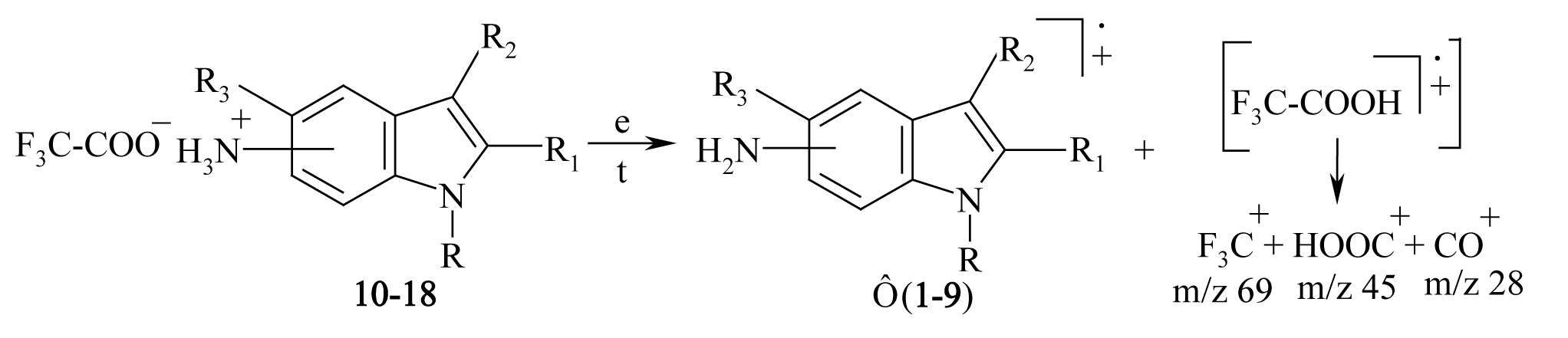 Таким образом, при идентификации 1Н-индол-5-,6-иламиния трифторацетатов с противомикробным действием возможно использование масс-спектрального метода, для проведения которого достаточно незначительного количества (2–3 мг) анализируемого вещества. Из картины масс-спектров солей 10–18 следует, что их высокотемпературная электронная ионизация протекает с образованием молекулярных ионов соответствующих органических оснований – 1Н-индол-5-,6-иламинов и фрагментных частиц распада трифторуксусной кислоты с m/z 69, 45, 28, что свидетельствует о солях – трифторацетатах. Также по характеристикам сигналов (m/z, Iотн.) фрагментных ионов в масс-спектрах и имеющимся литературным данным по масс-спектрометрии замещенных индолов, ароматических аминов, карбоновых кислот составлены и обсуждены обоснованные схемы распада молекулярных ионов органических оснований – 1Н-индолиламинов, в которых даны механизм образования, строение фрагментных ионов, возникающих в условиях электронной ионизации. Выявленные общие, а также индивидуальные для отдельных представителей с определенным характером и местом замещения в индольном бицикле закономерности поведения в условиях масс-спектральной съемки ионрадикалов 1Н-индолиламинов дают возможность судить об их строении, а, следовательно, в целом о строении замещенных 1Н-индол-5-, 6-иламиния трифторацетатов.