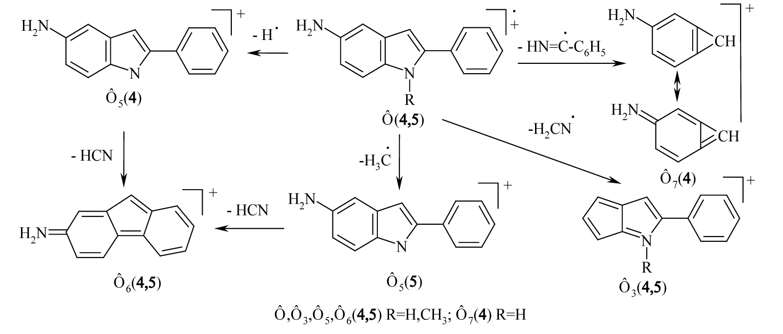 Как уже отмечалось в случае соединения 3, такая фрагментация характерна для β-незамещенных индолов. Сигнал фрагментного иона Ф5 с m/z 207(4, 5) в масс-спектре как соединения 4, так и 5 следует объяснить элиминированием атома водорода от молекулярного иона Ф(4) и метильного радикала от – Ф(5). Наличие в масс-спектрах солей 13, 14 сигнала фрагментного иона Ф6(4, 5) с m/z 180 дает возможность судить о характерной для производных 2-фенил-1Н-индола перегруппировке иона Ф5 с потерей молекулы цианистого водорода [6], что подтверждают соединения 4, 5 как производные 2-фенил- и 1-метил-2-фенил-1Н-индолов. Сигналы фрагментных ионов Ф3(4, 5) с m/z 180(4), 194(5) в спектрах солей 13, 14 отвечают элиминированию от молекулярных ионов Ф(4, 5) частицы СН2N с массовым числом 28 и дают возможность свидетельствовать о том, что Ф(4, 5) являются молекулярными ионами 2-фенил- и 1-метил-2-фенил-1Н-индол-5-иламинов, а соединения 13, 14 их трифторацетатами.