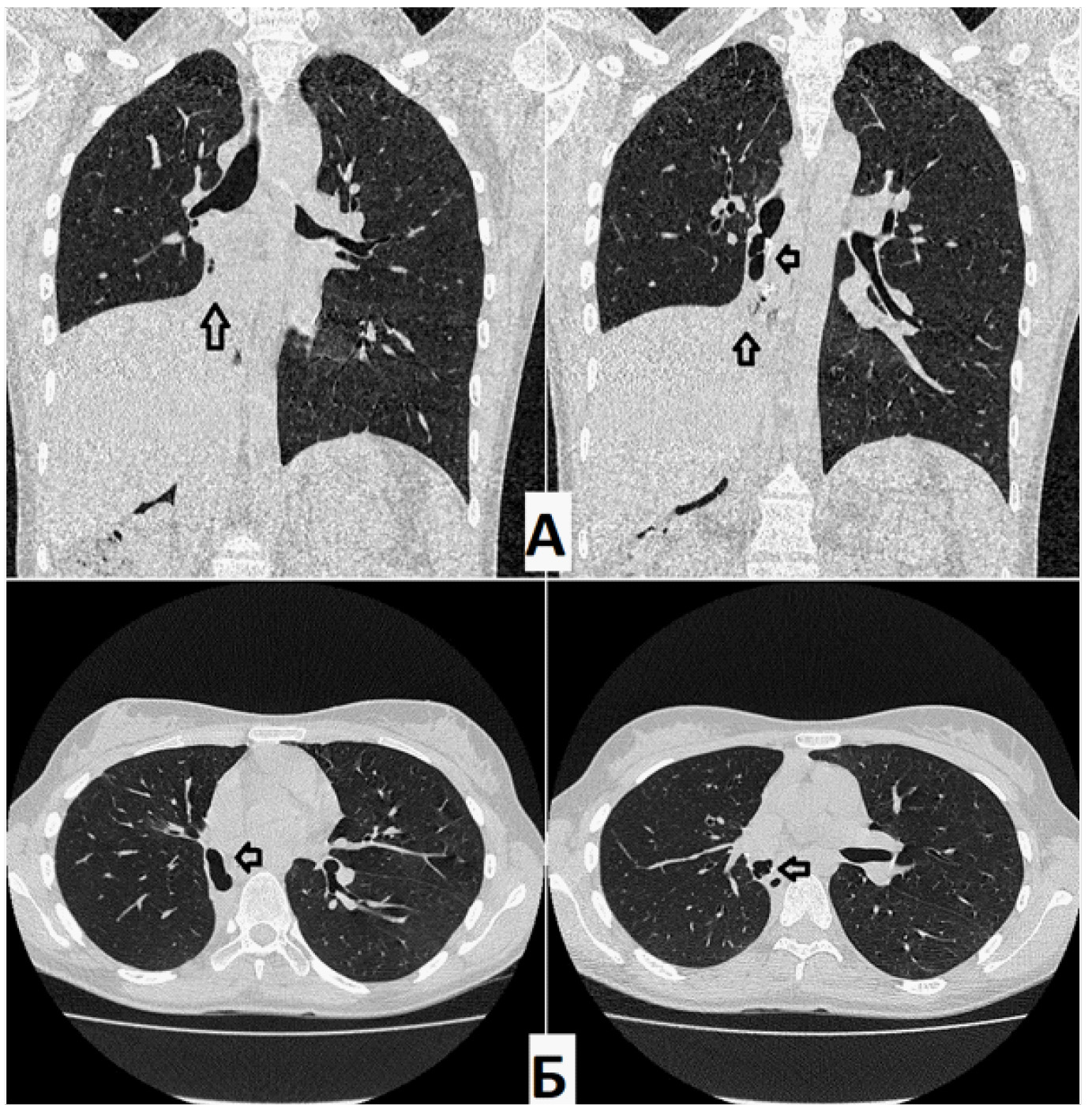 Рис. 4. Компьютерная томография (А – фронтальная проекция; Б – аксиальная проекция) через 1,5 месяца. Остаточная плевральная полость справа латерально и парамедиастинально. В динамике – полость увеличилась в размерах