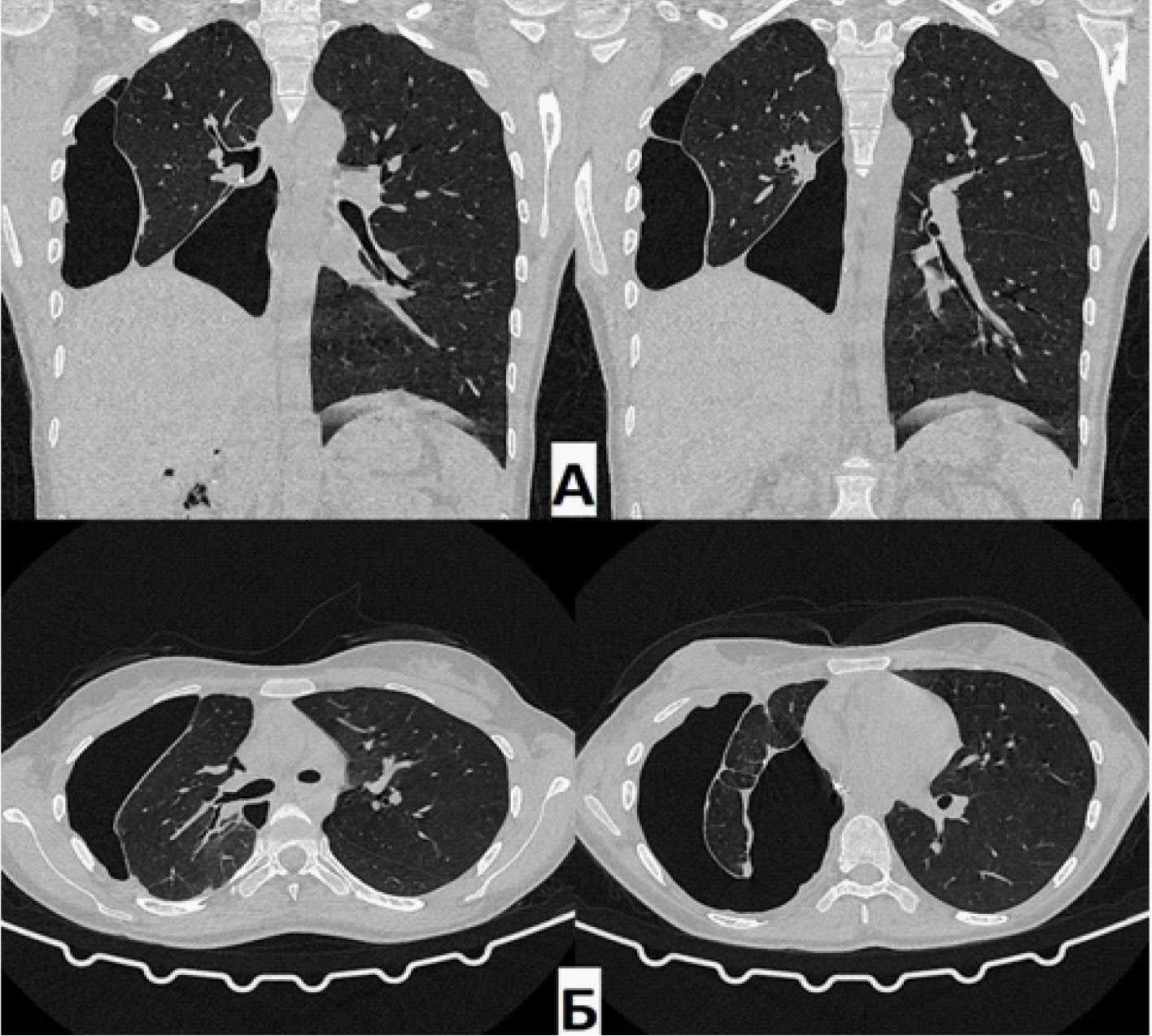 Рис. 5. Компьютерная томография (А – фронтальная проекция; Б – аксиальная проекция) через 1,5 года. Отсутствие остаточной плевральной полости справа