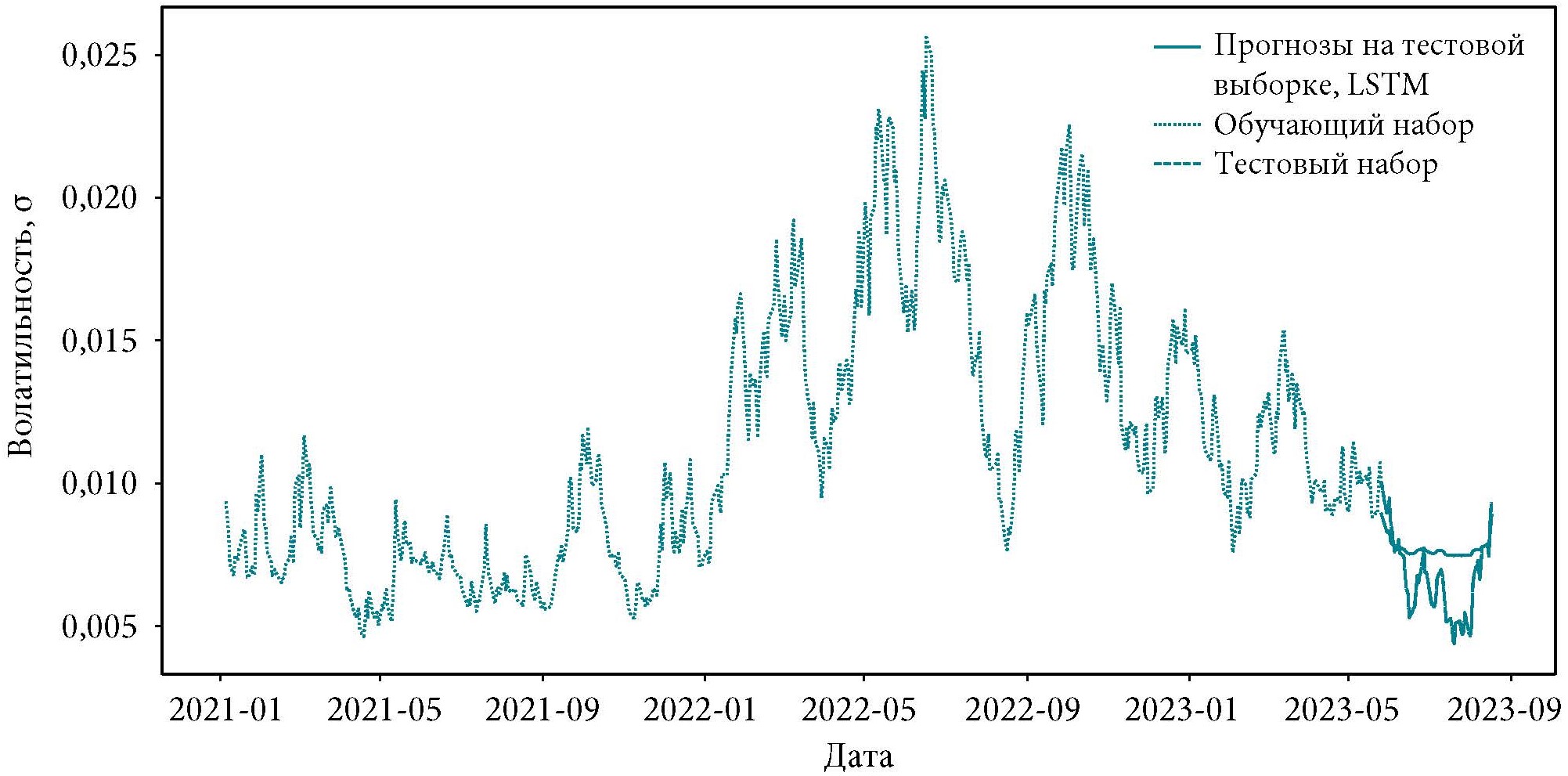 После обучения LSTM-сети на данных обучающей выборки был реализован прогноз волатильности на тестовой выборке (рис. 3).