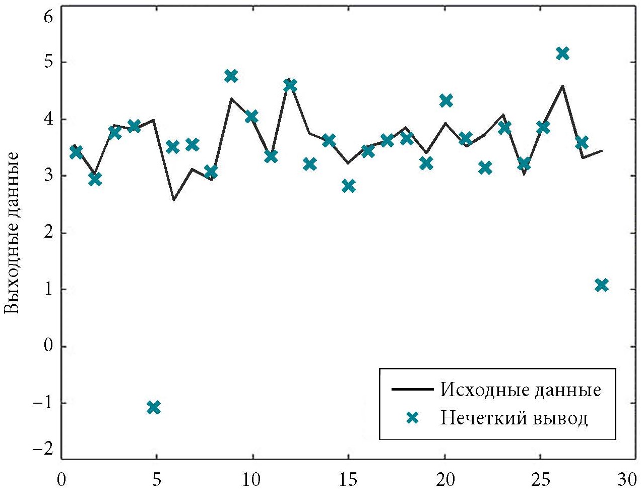 Далее аналогично находится выходное значение нечеткой системы FIS на тестовой выборке, которое также сравнивается со значением промышленного электропотребления на этой выборке. Среднеквадратичная ошибка при этом сравнении равна 1,079. Как видно, RMSE на тестовой выборке намного выше аналогичной ошибки на обучающей выборке. На рис. 2 представлено сравнение выходных данных нечеткой системы и электропотребления (исходные данные) на тестовой выборке. Отметим, что все описанные ошибки и сравнения приведены для системы нечеткого вывода без обучения.