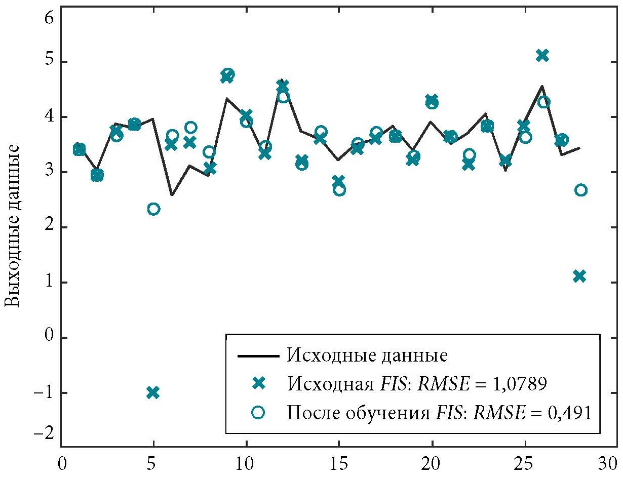 Сначала используется относительно короткий период обучения (20 итераций) без применения данных проверки, а затем полученная модель FIS с обучением проверяется на основе данных тестовой выборки. Постепенно увеличивая количество итераций, можно добиться минимального расхождения между выходным значением обученной нечеткой системы FIS на тестовой выборке и значением промышленного электропотребления на ней же.