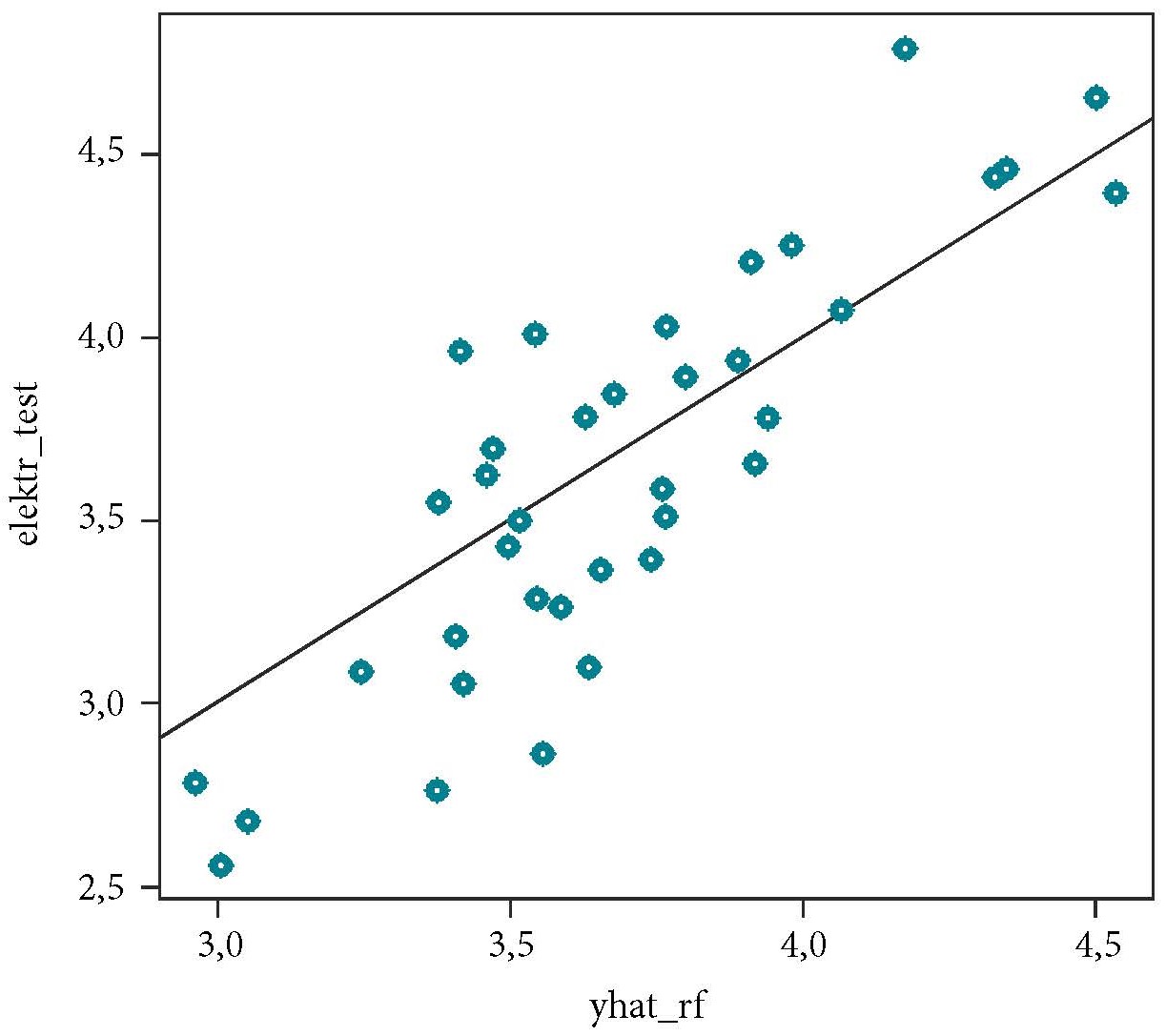 Рис. 4. Диаграмма соответствия электропотребления на тестовой выборке (elektr_test) и предсказаний исследуемой модели (yhat_rf) при применении метода случайного леса