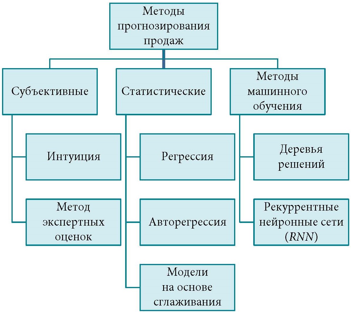 Прогнозирование продаж является важным инструментом для банковского сектора, позволяющим оптимизировать стратегию продаж, управлять запасами и планировать бюджет. Методы прогнозирования продаж можно разделить на субъективные, статистические и методы машинного обучения (рис. 1) [8; 9]. Каждая из этих групп имеет свои преимущества и недостатки, и нашей целью является поиск оптимальной модели прогнозирования продаж для ПАО «Сбербанк».