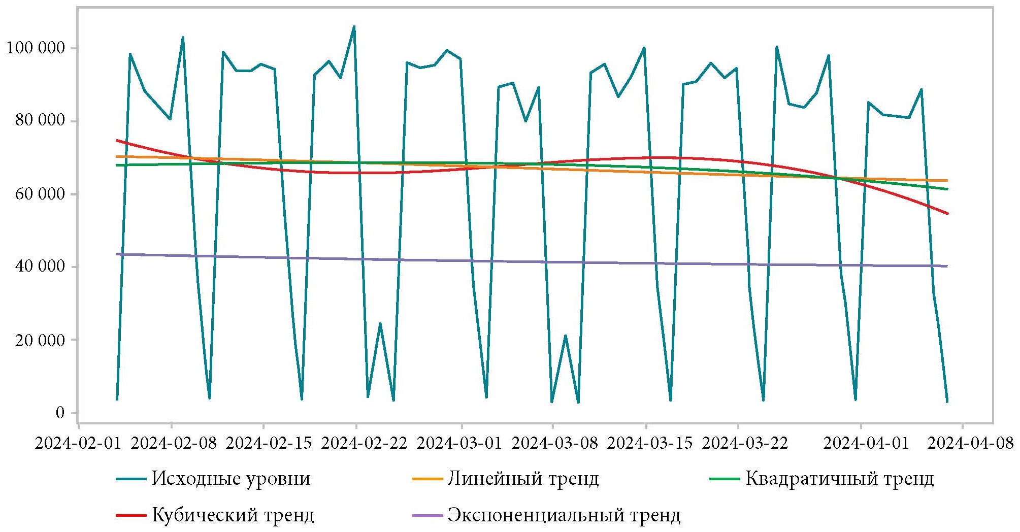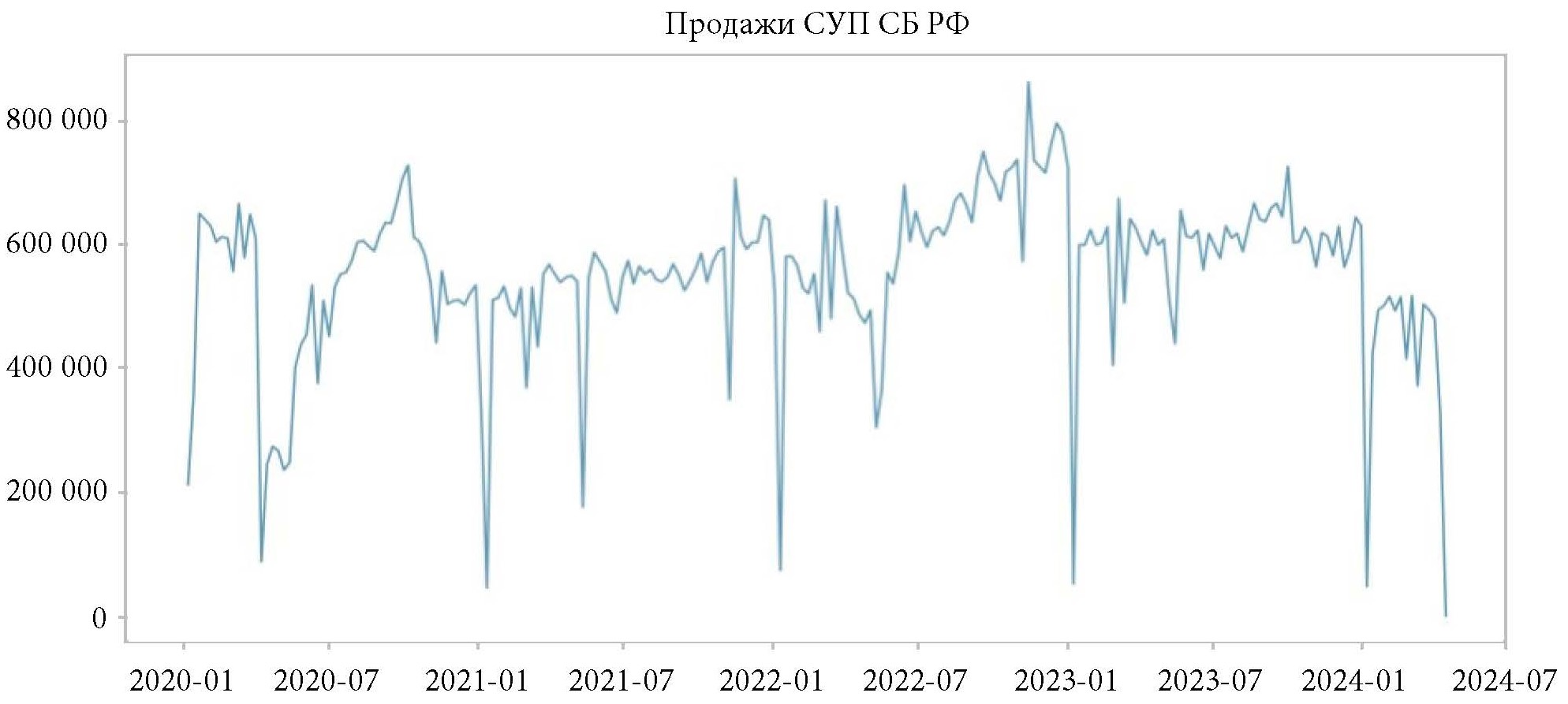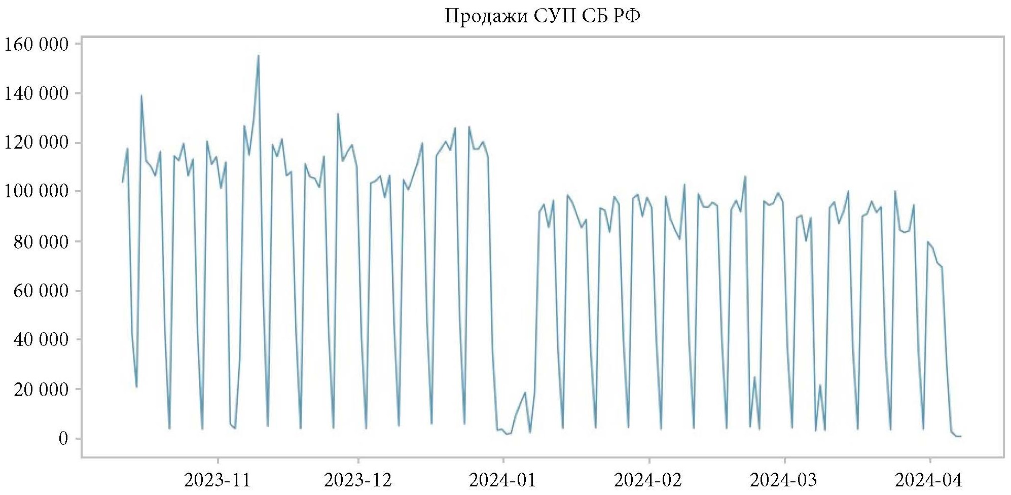 Перед нами стоит задача краткосрочного дневного прогноза, поэтому рассмотрим данные за последние шесть месяцев – с 11.10.2023 до 07.04.2024 (рис. 3). Наблюдается еженедельная сезонность, а также низкие объемы продаж во время новогодних праздников. Отметим, что с начала нового года произошло изменение методологии и пересчет СУП банка.