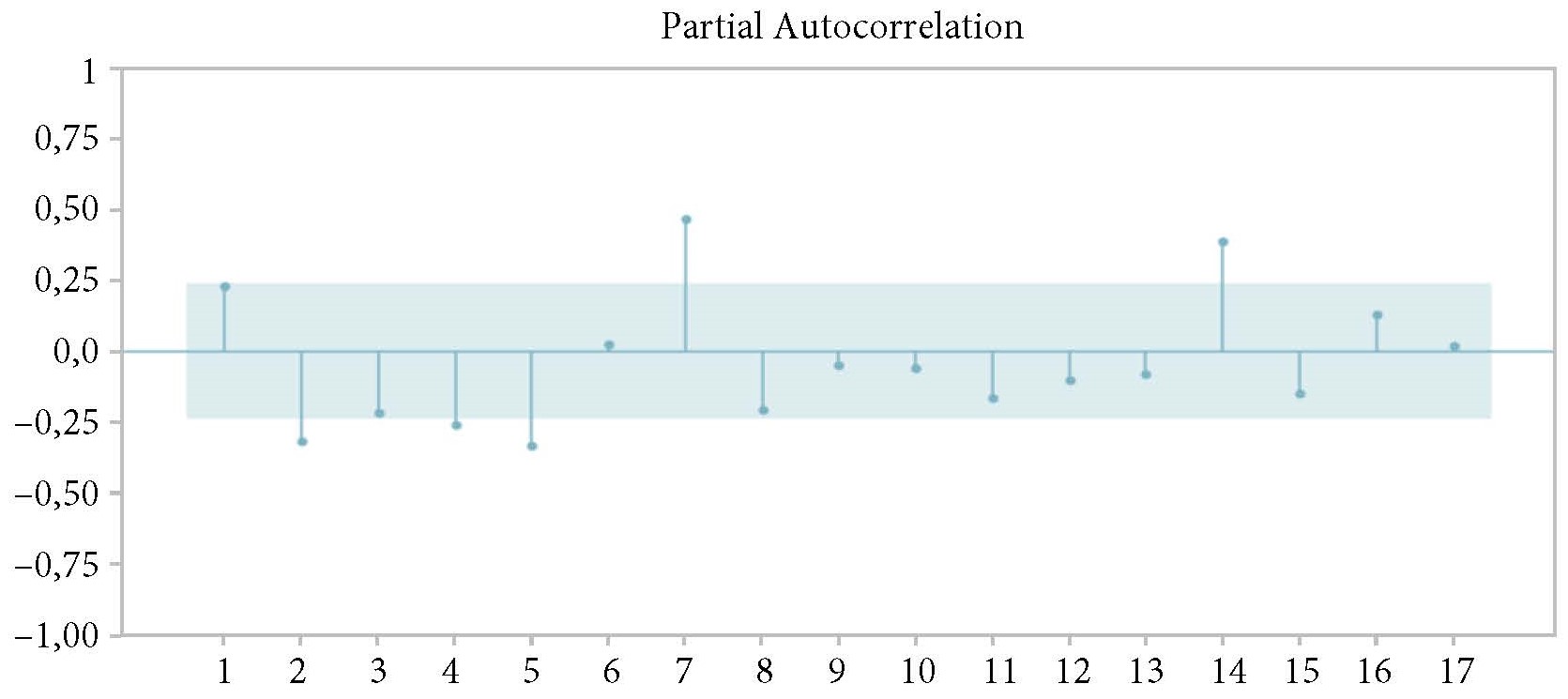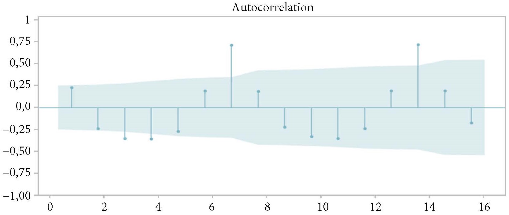 Будем следовать методологии Бокса–Дженкинса для подбора оптимальной ARIMA-модели [11; 12]. Начнем с построения ACF и PACF (рис. 7–8 соответственно).
