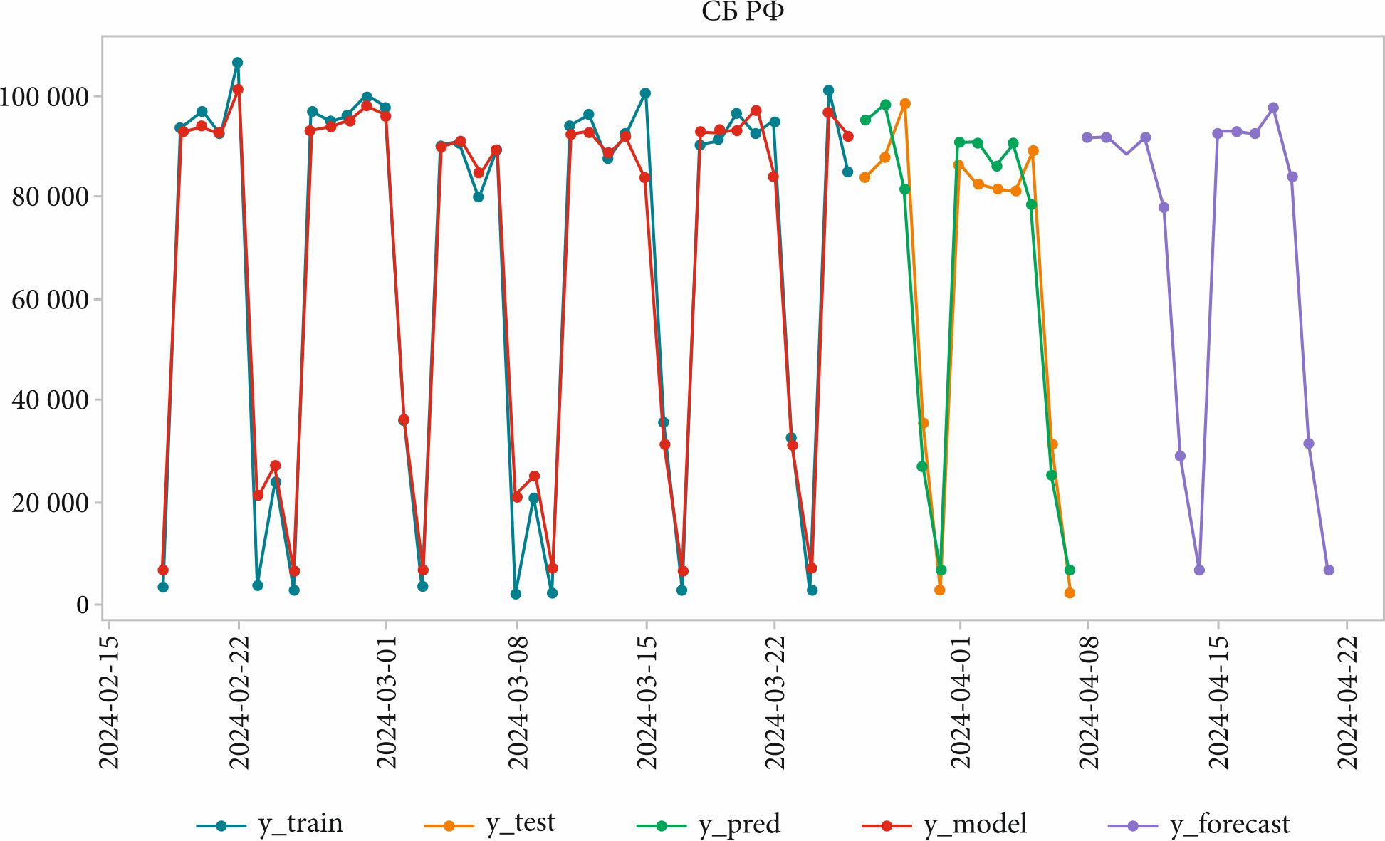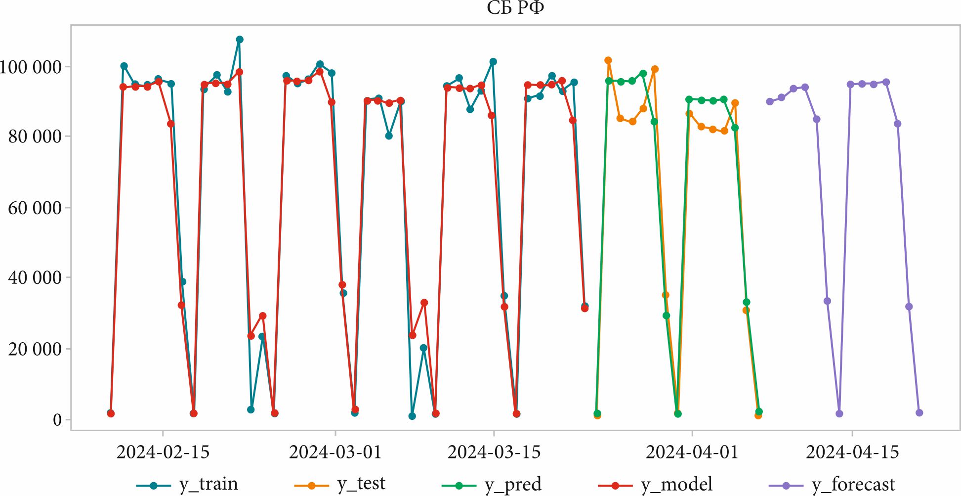 Далее построим модели для каждой категории данных сначала по отдельности, затем объединим их в общую модель. Каждая из обозначенных моделей построена с использованием метода случайного леса (рис. 18). Этот подход позволил учесть особенности и сезонность в каждой категории данных, а затем объединить их для получения общего прогностического результата. Результаты оценки качества данной модели представлены в табл. 7.