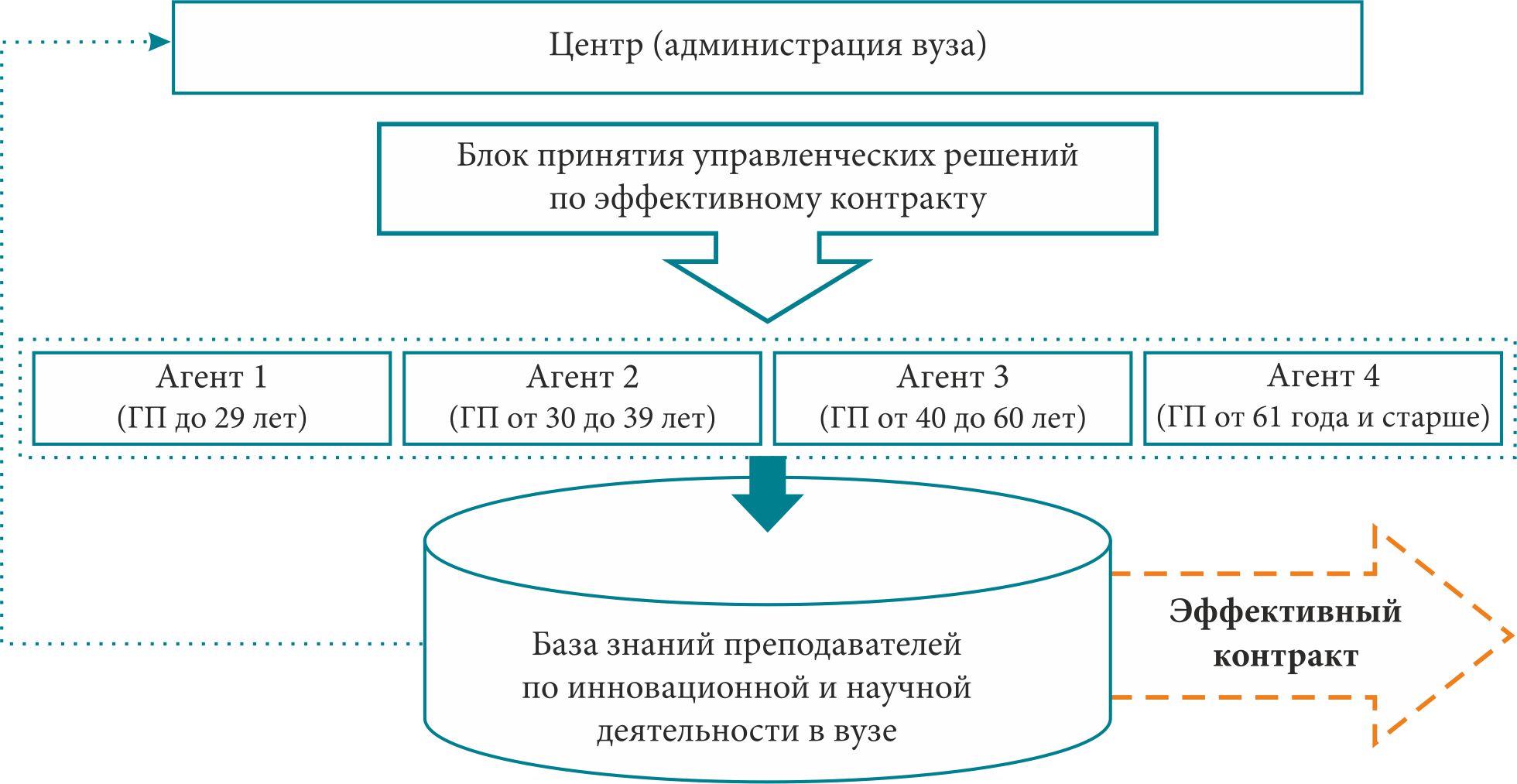 На рис. 2 показано, что согласно этому плану, Центр вырабатывает управленческие решения (блок принятия управленческих решений по эффективному контракту) для каждого Агента (группы преподавателей определенного возраста и определенных целевых показателей, являющихся для них наиболее важными) для того, чтобы по эффективному контракту для каждого игрока была установлена максимальная прибыль.
