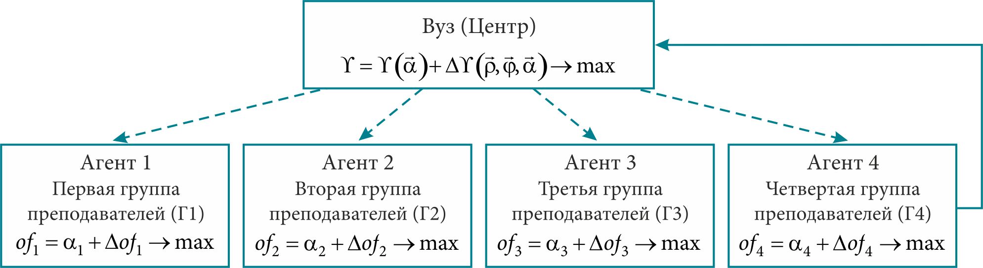 В настоящее время у администрации вуза отсутствует разделение на группы при формировании системы стимулирования, а также не учитываются ограничения, накладываемые на отдельные группы Агентов. Важным моментом является разработка общей модели взаимодействия Центра и Агентов (рис. 3).