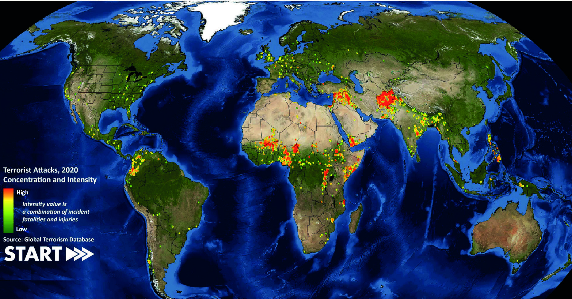 Рис. 4. Тепловая карта географической концентрации и медико-биологических последствий ТА в 2020 г. [https://www.start.umd.edu/gtd/images/START_GTD-Heatmap_2020.jpg].