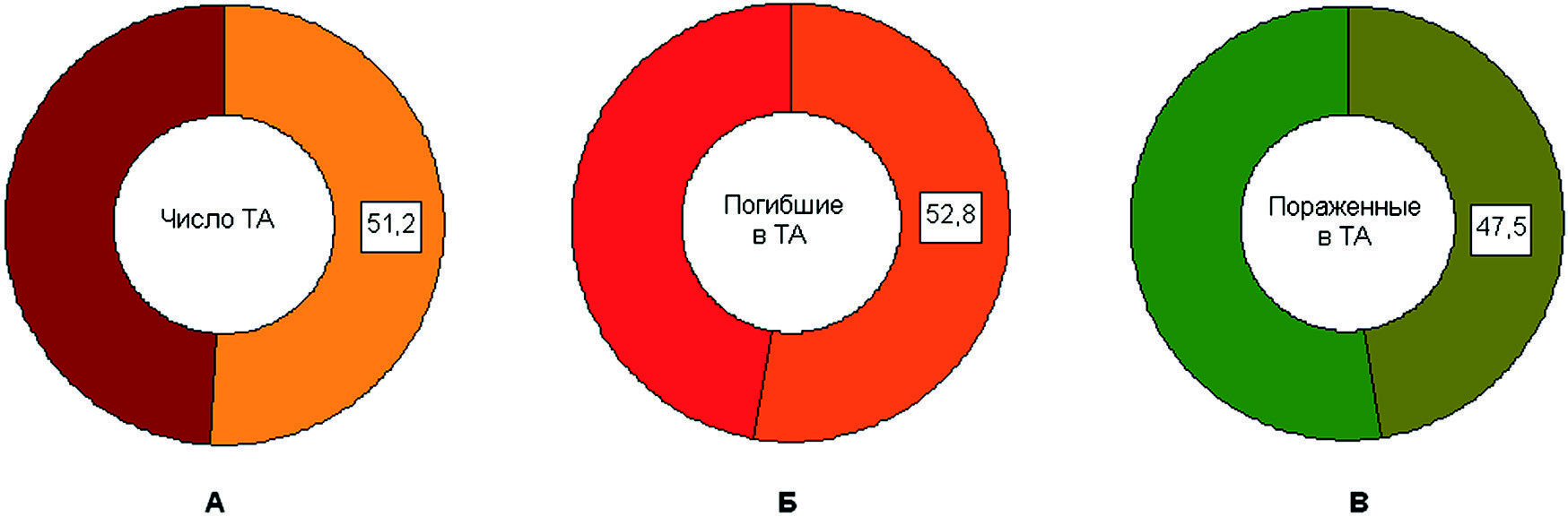 На рис. 8 показана структура частотного анализа погибших в одном ТА. Оказалось, что погибших не было в 43,7 % ТА, 1–10 погибших оказалось в 46,4 %, 11–50 – в 4,1 %, 51–100 – в 0,2 %, 101 и более – в 0,1 %, неизвестно – в 5,5 % ТА (см. рис. 8А). В динамике структуры отмечается увеличение тяжести ТА, например, выявлено уменьшение доли ТА, в которых не было погибших, увеличение доли – с 1–10, 11–50 и неизвестным количеством погибших (см. рис. 8Б). Динамика доли 51–100 и 100+ погибших в одном ТА напоминает инвертированную U-кривую с максимальным показателем в 2014–2016 гг. – 0,31–0,36 и 1,3–1,7 % соответственно.