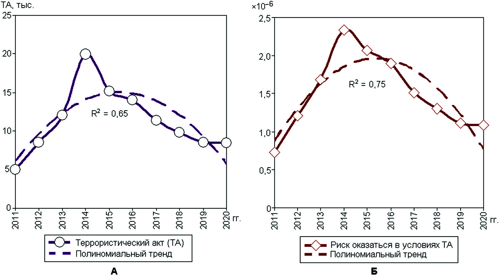 Среднегодовой показатель террористических актов с 2011 по 2020 г. в мире был 110 тыс. или 10,7 [8, 5; 14, 1] тыс., погибших людей – 25,8 тыс. или 23,1 [20, 4; 35, 3] тыс. человек, пораженных – 28,4 тыс. или 25,5 [18, 8; 40, 6] тыс. человек. Полиномиальные тренды указанных показателей напоминают инвертированные U-кривые с уменьшением данных в последний период наблюдения.