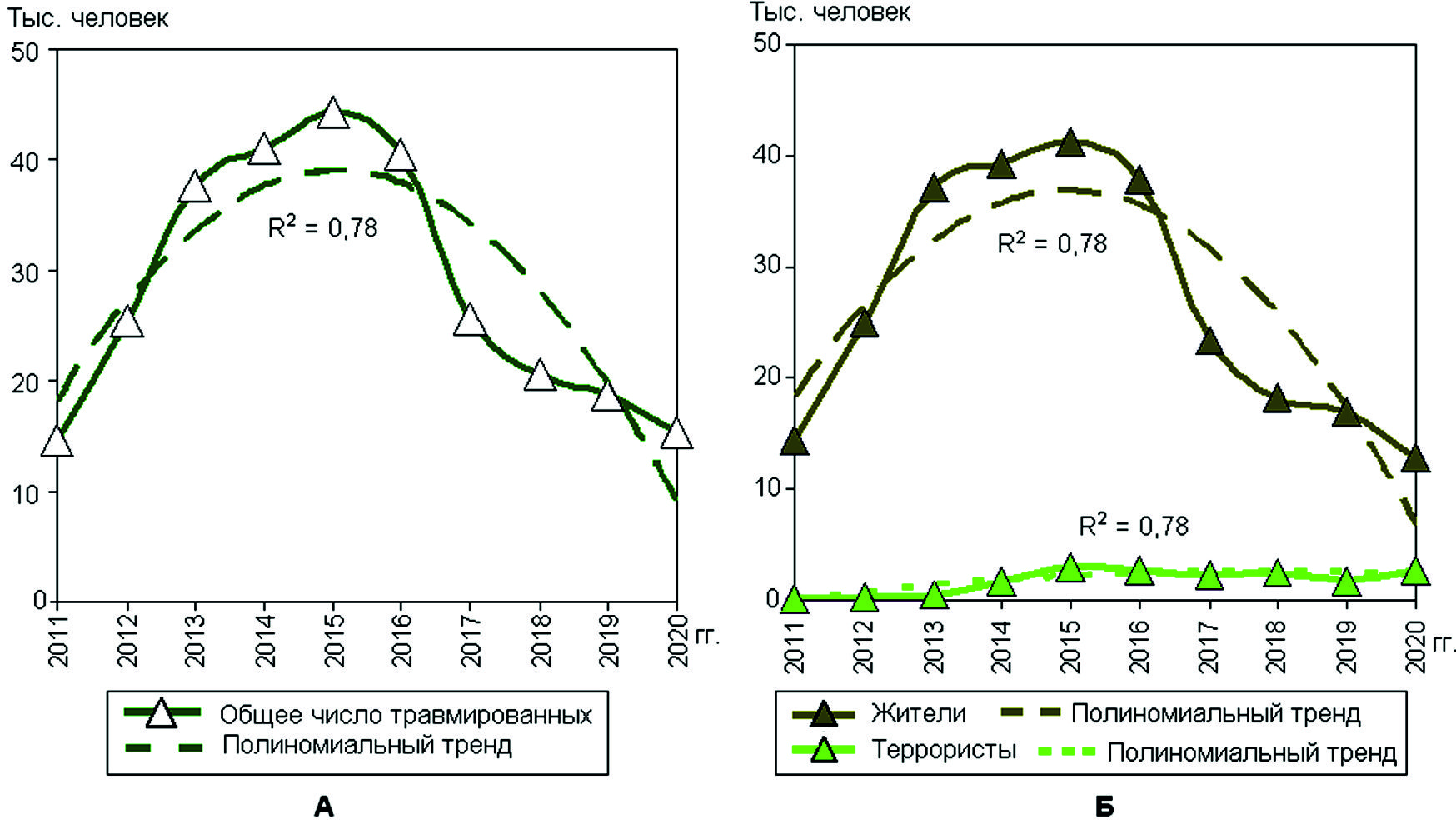 Динамика получивших травмы в ТА частных лиц и бизнесменов показана на рис. 19А, военнослужащих и полицейских – на рис. 19Б. При высоких коэффициентах детерминации полиномиальные тренды травмированных лиц напоминают инвертированную U-кривую с уменьшением данных в последний период наблюдения (см. рис. 19).