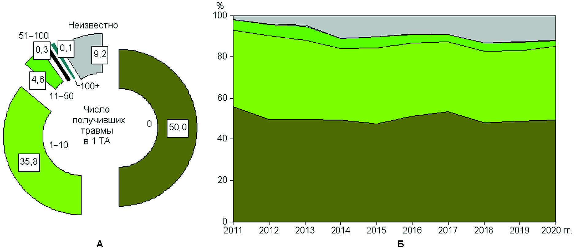 На рис. 10А показана структура и динамика структуры частотного анализа людей, получивших травмы в одном ТА. Оказалось, что не было травмированных в 50 % ТА, 1–10 травмированных оказалось в 35,8 %, 11–50 – в 4,6 %, 51–100 – в 0,3 %, 101 и более – в 0,1 %, неизвестно – в 9,2 % ТА. В динамике структуры отмечаются увеличение доли с неизвестным количеством травмированных лиц и тенденция уменьшения доли – без пораженных и с другим количеством травмированных (1–10, 11–50, 51–100, 101+) в одном ТА (см. рис. 10Б).