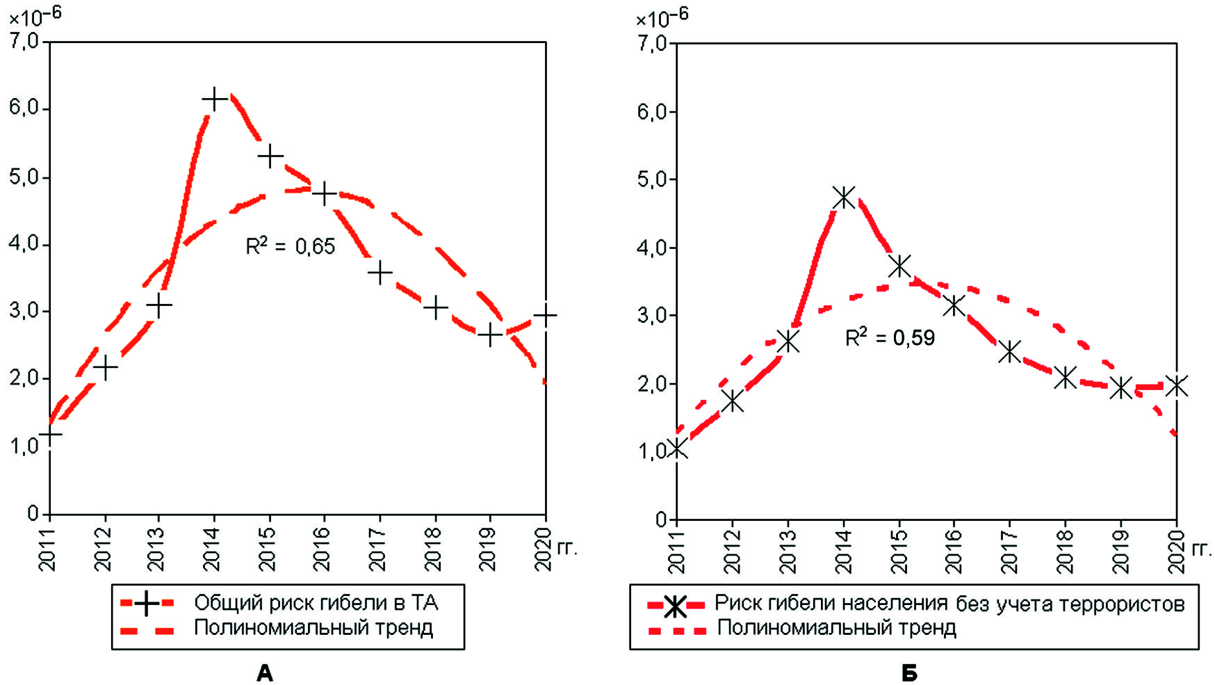 Полиномиальные тренды динамики индивидуальных рисков погибнуть в ТА с применением взрывчатых веществ и огнестрельного оружия при разных по значимости коэффициентах детерминации показывают инвертированные U-кривые с уменьшением данных в последний период наблюдения (рис. 16А). Полиномиальные тренды индивидуальных рисков гибели людей в ТА с оружием ближнего боля и зажигательными веществами при низком коэффициенте детерминации (R2 = 0,42) демонстрируют тенденцию роста показателей (см. рис. 16Б).