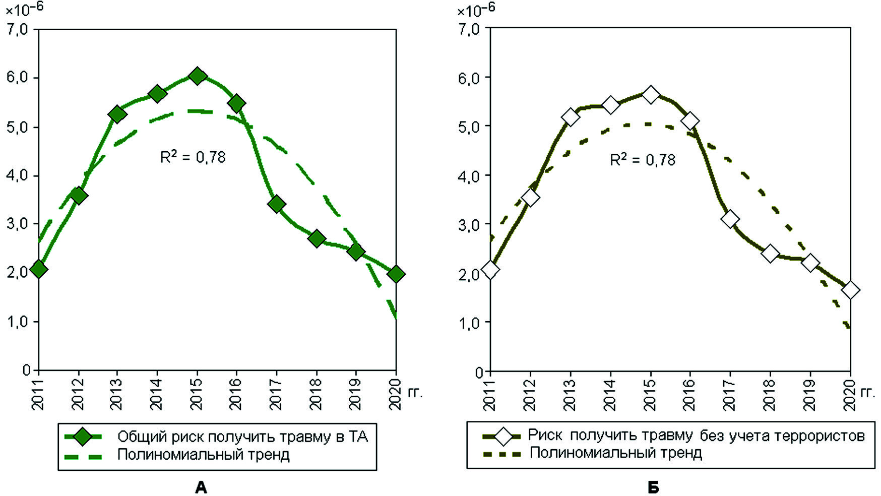 Полиномиальные тренды динамики индивидуальных рисков быть травмированным в ТА с применением взрывчатых веществ и огнестрельного оружия (рис. 17А), химических веществ и оружия ближнего боя (см. рис. 17Б) при разных по значимости коэффициентах детерминации показывают инвертированные U-кривые с уменьшением данных в последний период наблюдения.