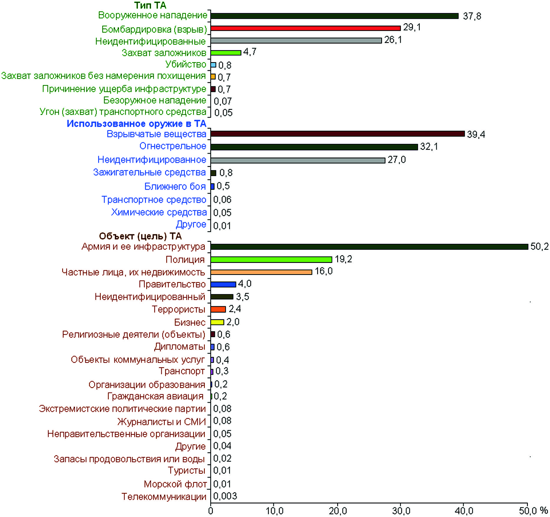 Объектами в структуре всех террористических актов в 91,4 % являлись военнослужащие, полицейские, частные лица (случайные прохожие), члены правительства и бизнесмены, их гибель составляла 86,8 % от структуры всех жертв, травмирование – в 84,2 % от всех пораженных. Перечисленные когорты населения представляли группы риска при терроризме.