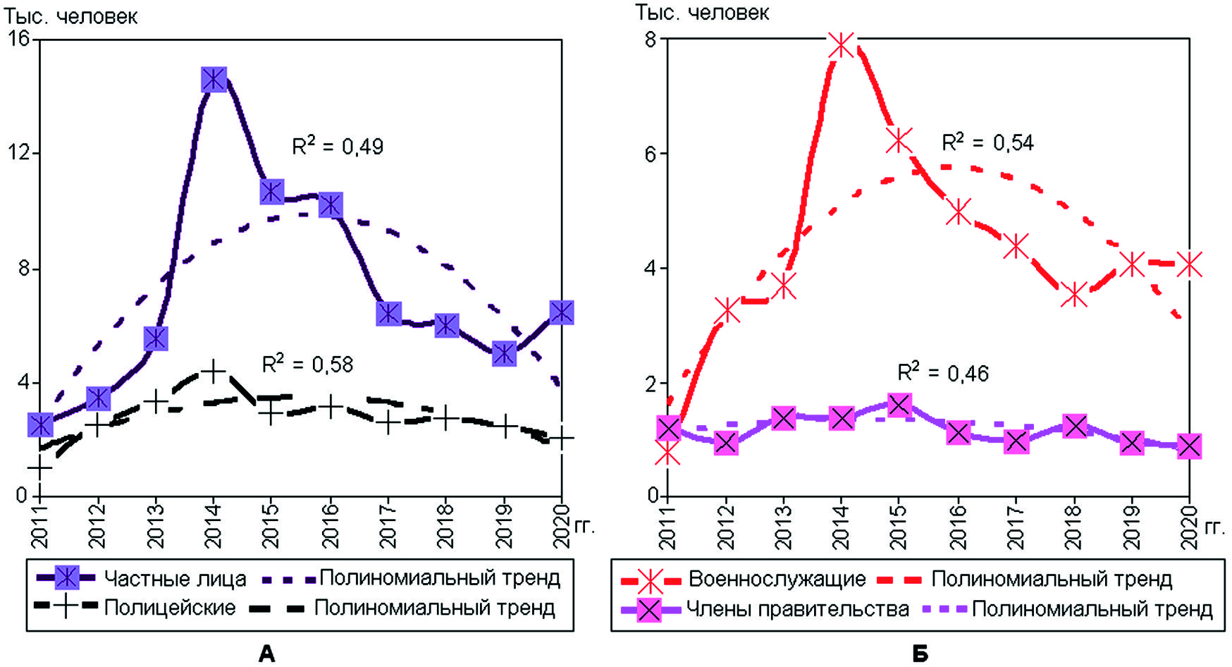 Полиномиальные тренды гибели в ТА частных лиц (прохожих) и полицейских (рис. 18А), военнослужащих и членов правительства (см. рис. 18Б) при разных по значимости коэффициентах детерминации напоминают инвертированные U-кривые с уменьшением данных в последний период наблюдения.