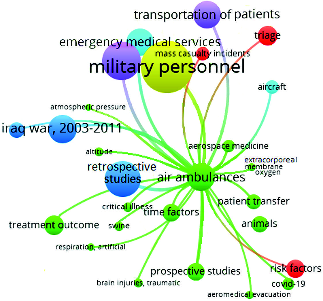Кластерный анализ, проведенный с помощью аналитической программы VOSviewer, позволил определить основные тенденции научных исследований в зарубежной научной литературе открытого доступа, направленные, прежде всего, на изучение общих вопросов военной медицины, организации лечебно-эвакуационных мероприятий, медицинской эвакуации и оказания медицинской помощи в различных условиях (чрезвычайные ситуации, вооруженные конфликты), что подтверждается сформированными кластерами статей и взаимосвязанными с ними ключевыми словами.