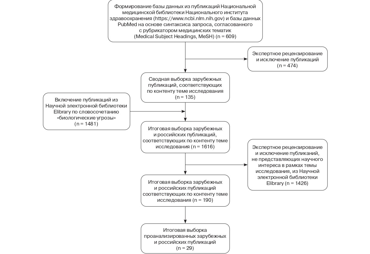 Для оценки существующих в мире проблем, связанных с биологическими угрозами и оказывающих влияние на национальные системы здравоохранения, провели аналитический обзор международных и российских научных публикаций. Анализ публикаций проведен по методу PRISMA (Preferred Reporting Items for Systematic Reviews and Meta-Analyses) (рис. 1).
