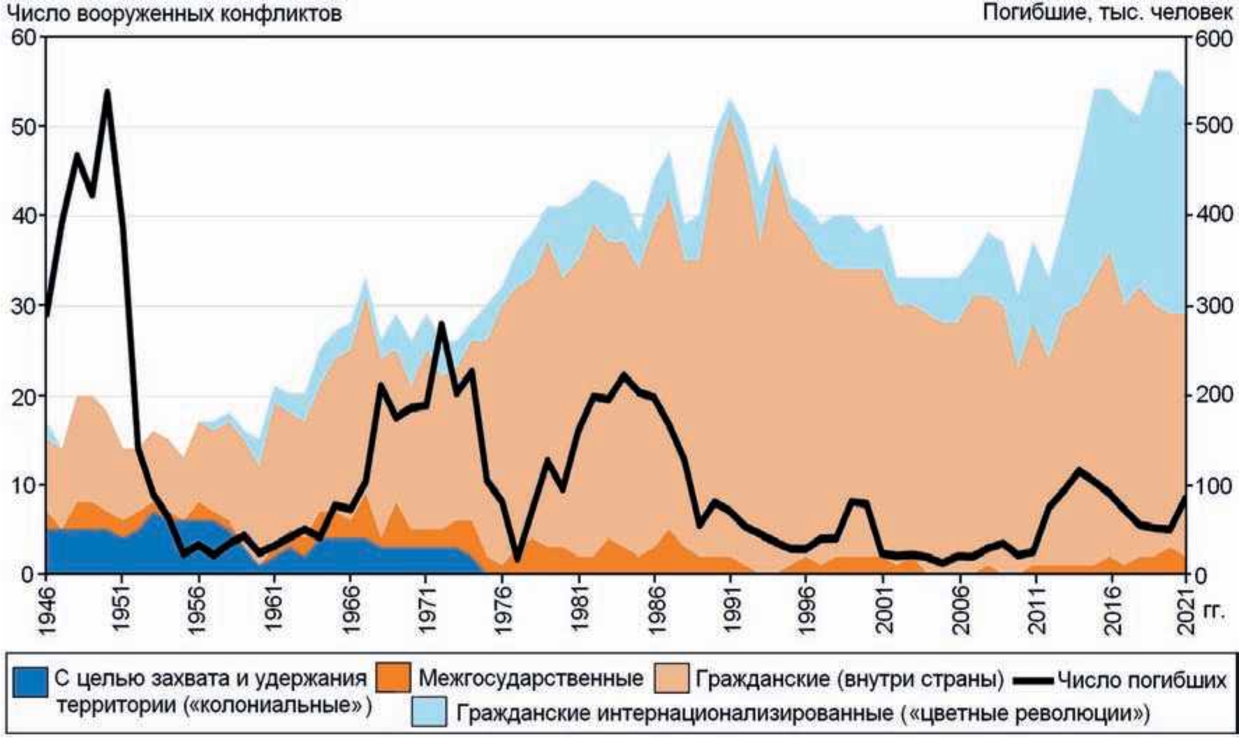 История последних 75 лет демонстрирует увеличение количества военных действий, в которых возникают как прямые потери (погибшие, раненые), так и косвенные – у мирного населения воюющих стран. Отмечен заметный рост гражданских вооруженных конфликтов и так называемых «цветных революций». При этом отмечается динамика увеличения военных конфликтов в мире при некотором снижении числа погибших в них. Как видно на рис. 1, в 2021 г. в мире произошли 54 вооруженных конфликта, в которых погибли около 90 тыс. человек.