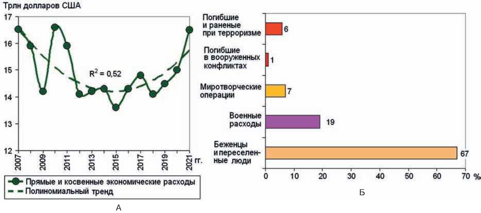 Из 163 стран, которые включены в рейтинг мирового индекса миролюбия (Global Peace Index), в 2021 г. (по сравнению с 2007 г.) ухудшение показателей зафиксировано в 84. Экономические расходы на милитаризацию и другие «воздействия насилия» в 2021 г. составили 16,5 трлн долларов США (рис. 2А), что эквивалентно 10,9 % от мирового валового внутреннего продукта или 2117 долларов США в расчете на 1 человека населения мира [11]. В расчет были включены как прямые, так и косвенные расходы, связанные с милитаризацией и другими «воздействиями насилия», а также «упущенные экономические выгоды» из-за неинвестирования в другие виды деятельности. Только экономическое поддержание вооруженных конфликтов в 2021 г. определялось суммой в 547,7 млрд долларов США, а вынужденное перемещение лиц составило 2/3 экономических последствий вооруженных конфликтов (см. рис. 2Б).