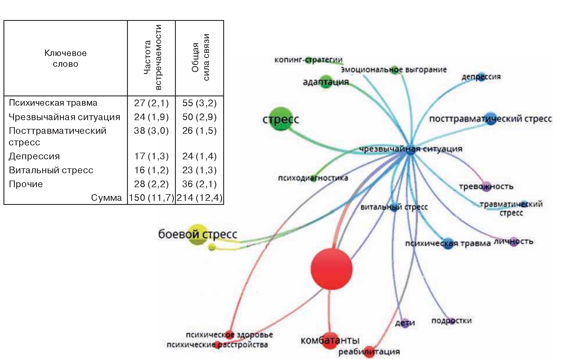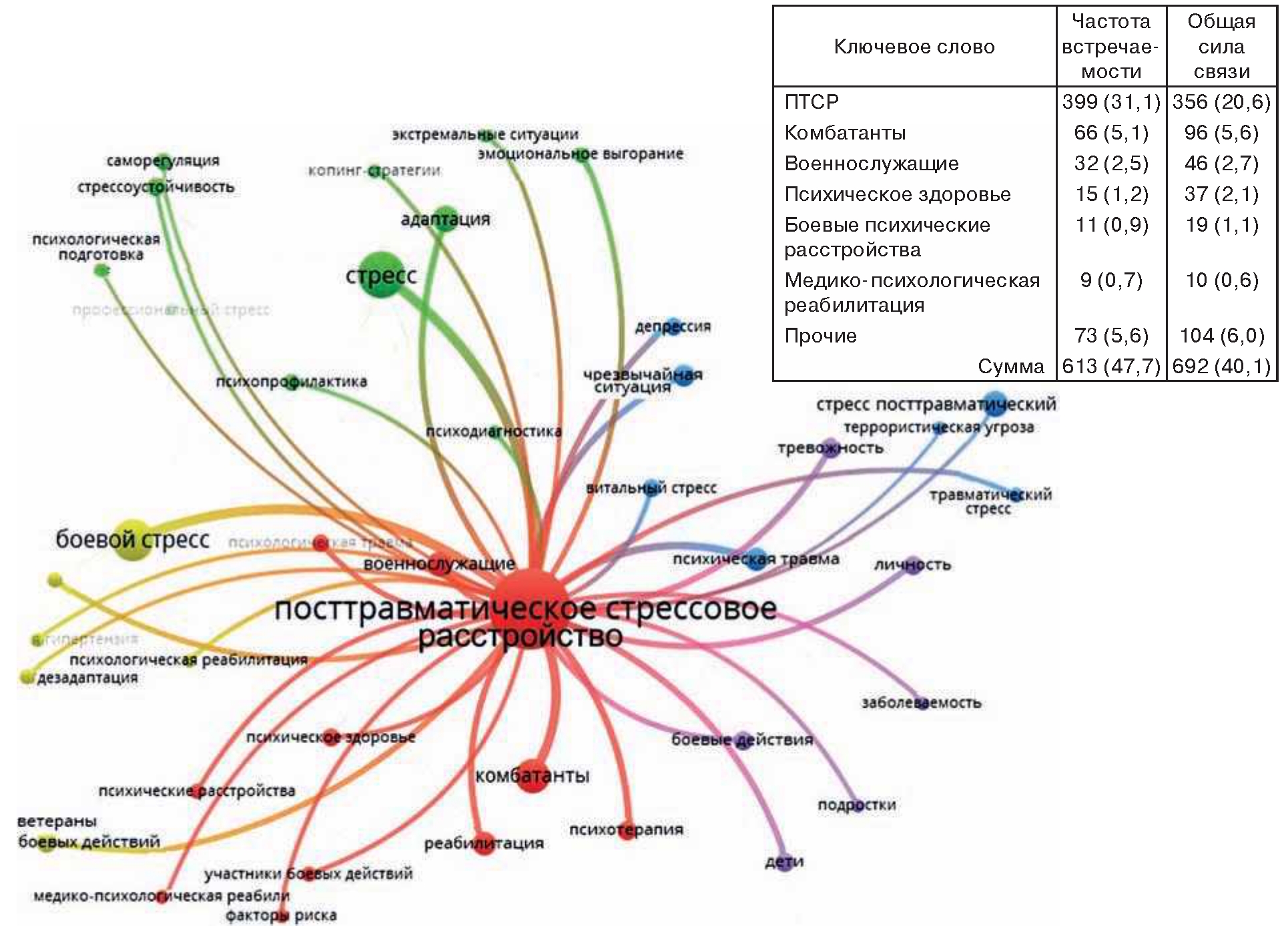 1-й кластер группировал статьи по боевым психическим расстройствам, в том числе, посттравматическому стрессовому расстройству (красный цвет на рисунке), и составил 40,1 % от общей силы связей массива публикаций по боевому стрессу;