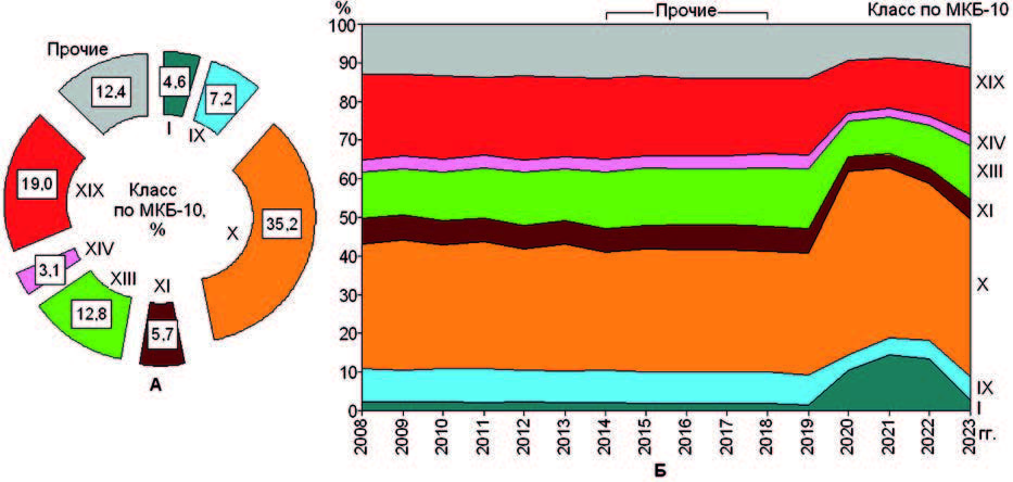 При анализе болезней по МКБ-10 акцент делали на классы, показатели которых имели вклад в структуру не менее 3 %, отдельных болезней (групп в классах) – не менее 0,1 %.