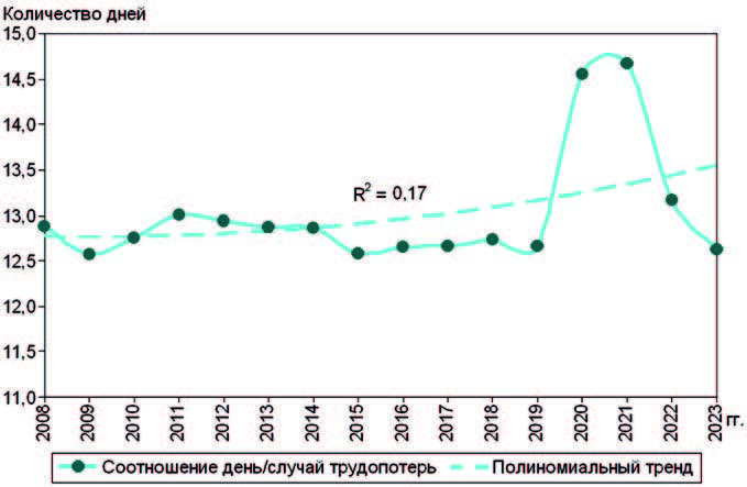 Среднемноголетний показатель общей заболеваемости составил 857,1 ‰, средний – (868,5 ± 35,7) ‰, первичной заболеваемости – 545,7 ‰ и (553,6 ± 27,5) ‰, нуждаемости в диспансерном наблюдении –123,8 ‰ и (125,9 ± 7,5) ‰, случаев трудопотерь – 572,4 ‰ и (576,1 ± 28,5) ‰, дней трудопотерь – 7398 ‰ и (7506 ± 391) ‰, первичной инвалидности – 10,9 • 10–4 и (11,1 ± 1,3) • 10–4, смертности – 90,1 • 10–5 и (92,4 ± 9,9) • 10–5. При высоких коэффициентах детерминации полиномиальные тренды общей заболеваемости, первичной инвалидности показывают уменьшение данных, первичной заболеваемости, случаев и дней трудопотерь напоминают U-кривую с увеличением показателей за счет случаев заболеваемости COVID-19 в 2020–2022 гг.