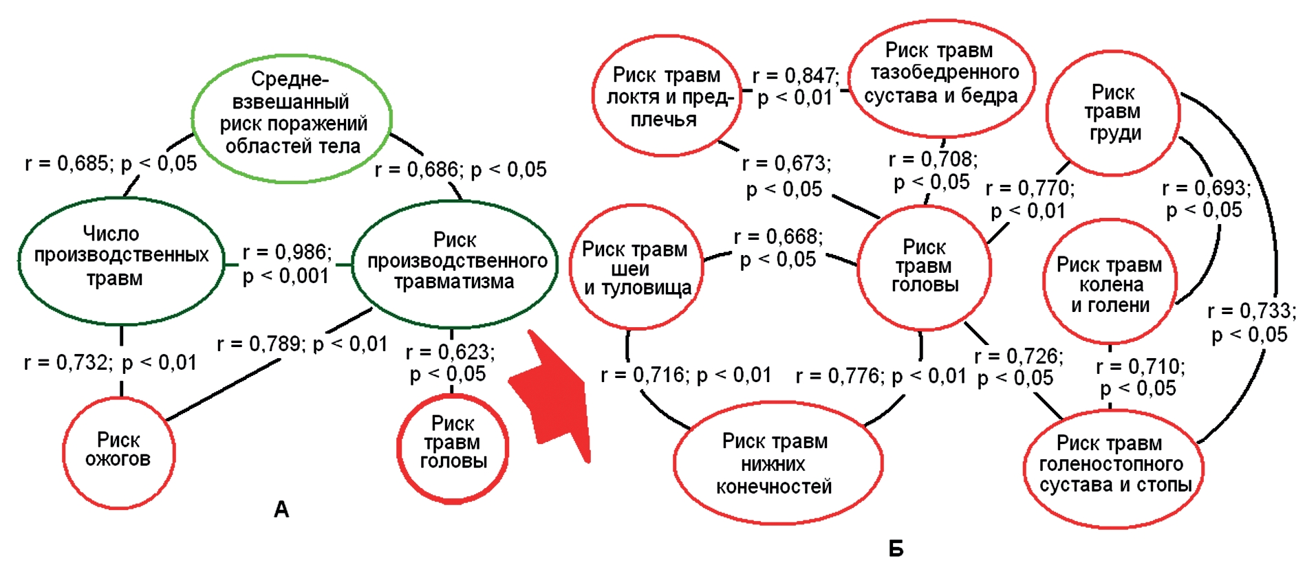 - Конгруэнтность трендов средне-взвешанного риска поражений областей тела, риска производственного травматизма и числа производственных травм – положительная и статистически значимая (r = 0,685 и r = 0,686 при p < 0,05 для обоих показателей), указанных двух показателей производственного травматизма и риска ожогов – высокая (r = 0,789 и r = 0,733 при p < 0,01 для обоих показателей); числа производственных травм и травм головы – средняя (r = 0,630 при p < 0,05), что указывает на участие в развитии трендов одинаковых (однонаправленных) показателей. Приведенные данные могут также характеризовать валидность наших расчетов по определению средневзвешенных прогнозируемых рисков нозологий. В генезисе поражений областей тела у пожарных при производственном травматизме ведущее место отводится травмам головы, которые способствуют потере равновесия и создают условия для падения, в результате чего травмируются другие области тела.