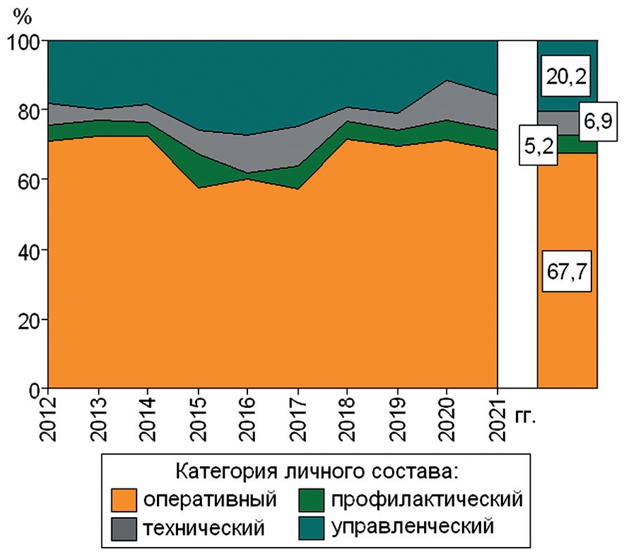 Среднегодовой уровень производственного травматизма рассчитали на 10 тыс. человек личного состава (×10⁻⁴). Предположили, что эти данные могут явиться показателями риска возникновения производственного травматизма в ближайшей перспективе. Среднегодовое число личного состава ФПС МЧС России (люди, подверженные риску производственного травматизма) было (191,3±3,3) тыс. человек, в том числе, оперативного состава, который участвует в оперативных дежурствах, проводит пожаротушение и ликвидацию последствий других ЧС, – (130,4±2,4) тыс. человек, профилактического персонала, осуществляющего надзорную деятельность, в том числе, за соблюдением мер профилактики пожаров, – (14,6±0,2) тыс., технического – (16,8±0,3) тыс. и управленческого персонала – (29,5±0,5) тыс. человек.