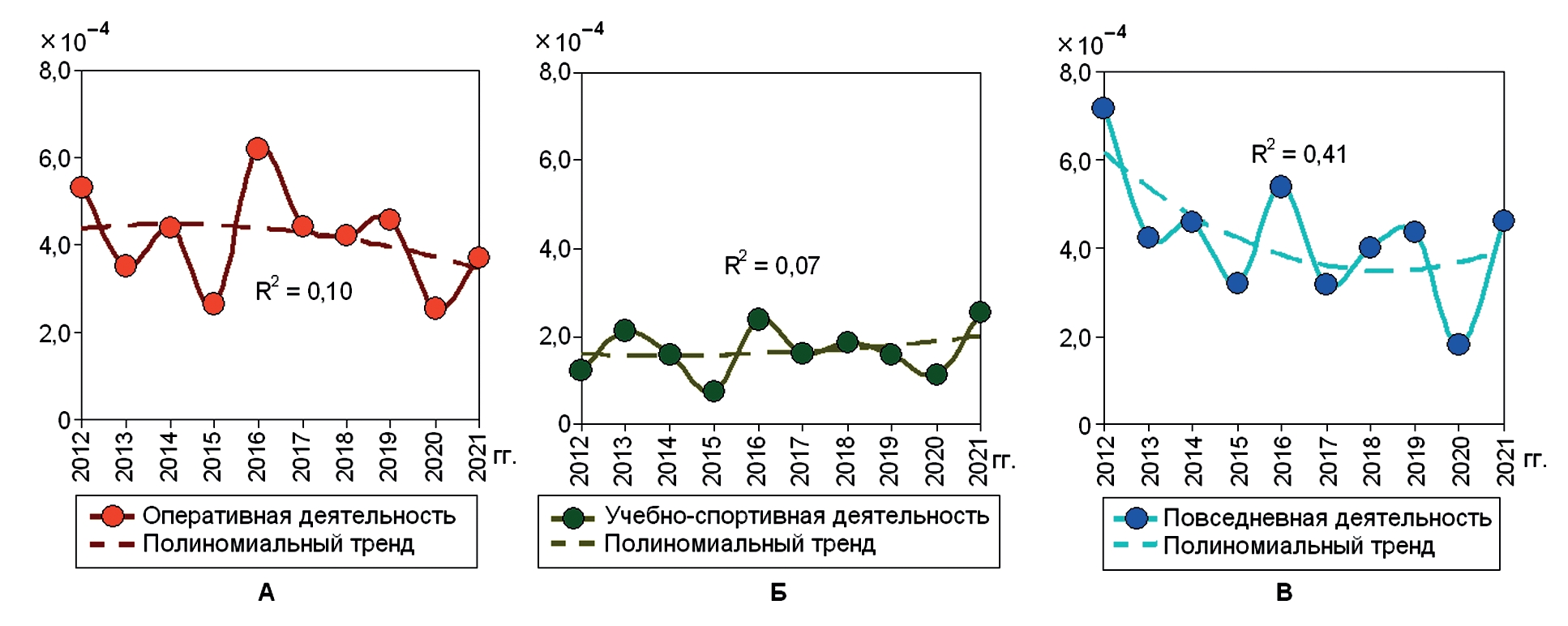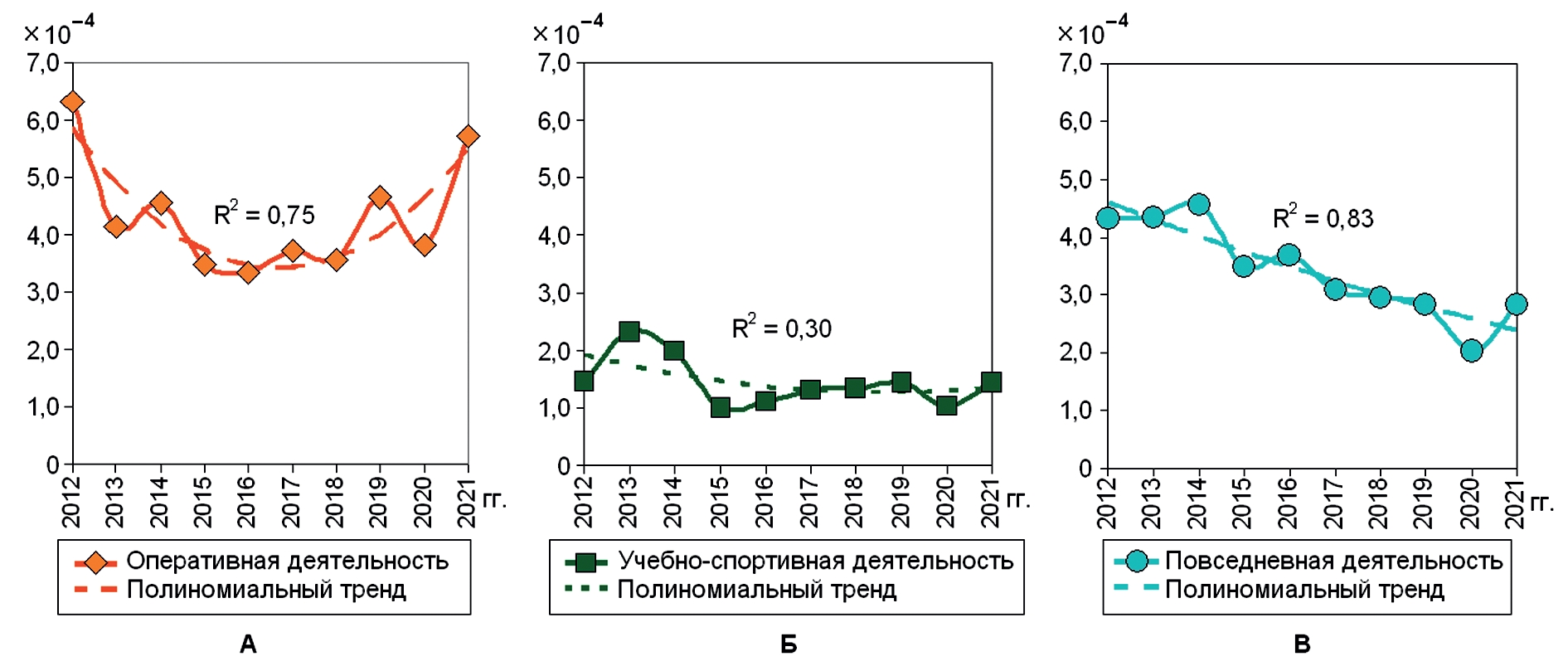 Развитие травм оценивали при помощи динамических рядов, для чего использовали полиномиальный тренд второго порядка. Коэффициент детерминации (R²) показывал связь построенного тренда с реальной тенденцией развития показателей, чем больше был R² (максимальный 1,0), тем более объективным оказался тренд [2]. Согласованность (конгруэнтность) изучаемых трендов травматизма провели с использованием коэффициента корреляции (r) Пирсона.